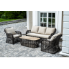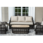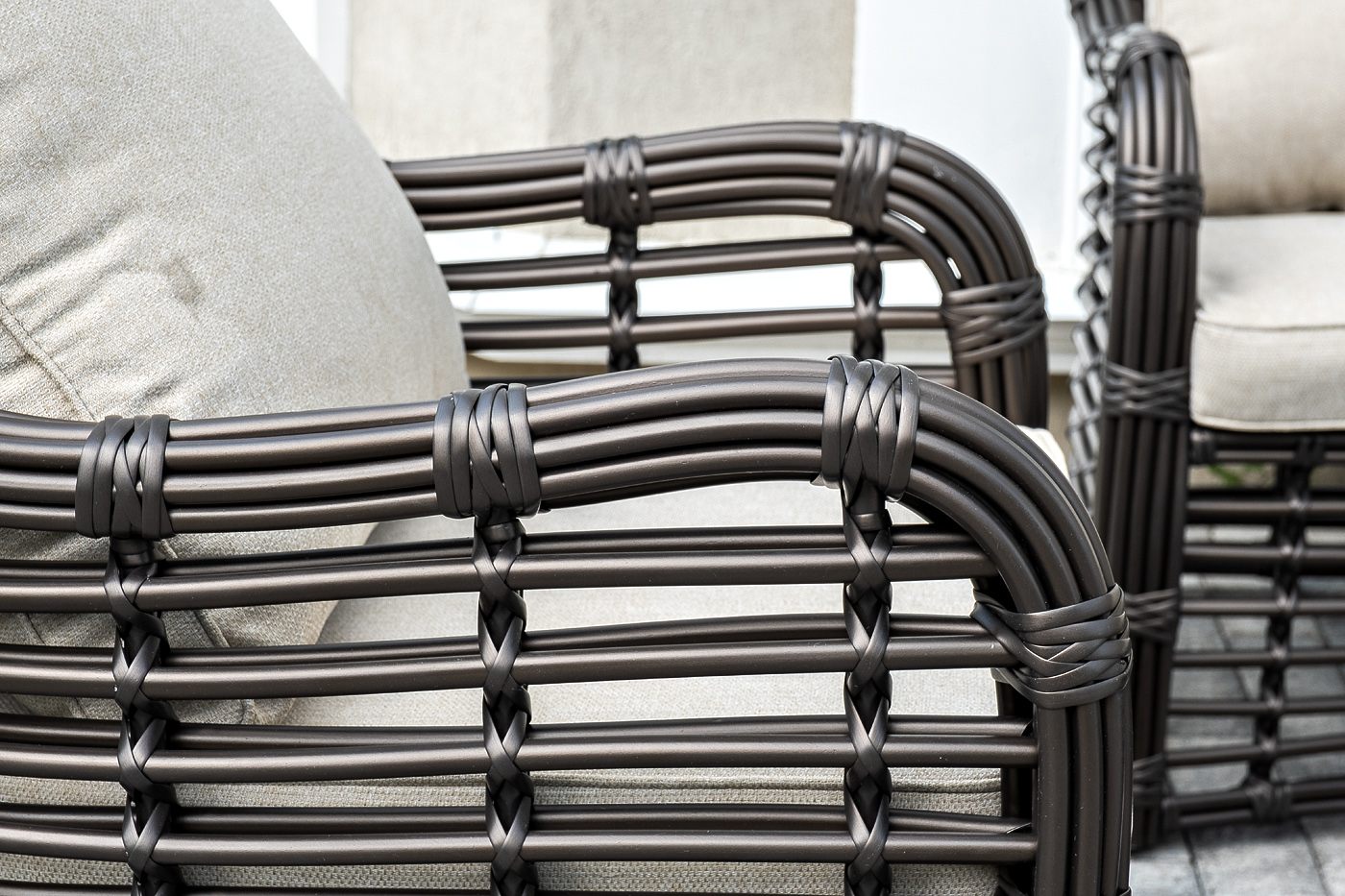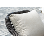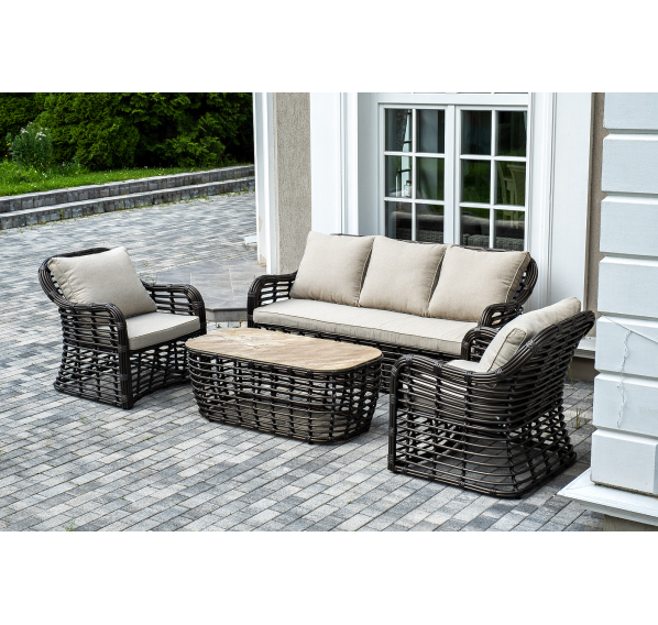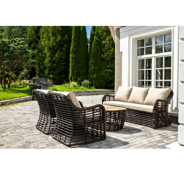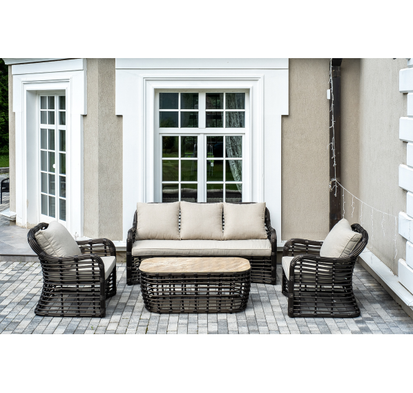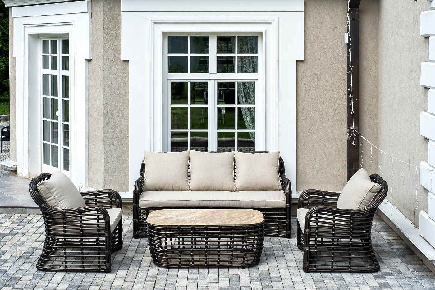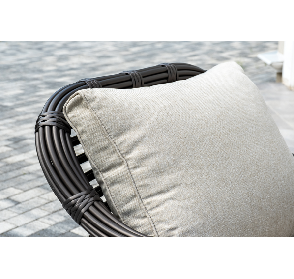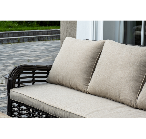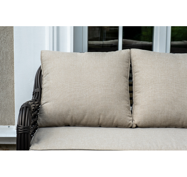 Плетеная мебель дополнена удобными подушками в бежевых чехлах. При их изготовлении используют полиэстер, плотность – 300гр/м2. Он обрабатывается влагоотталкивающей пропиткой для повышения защитных свойств материала.