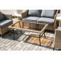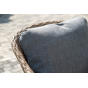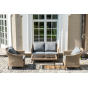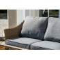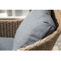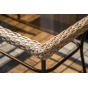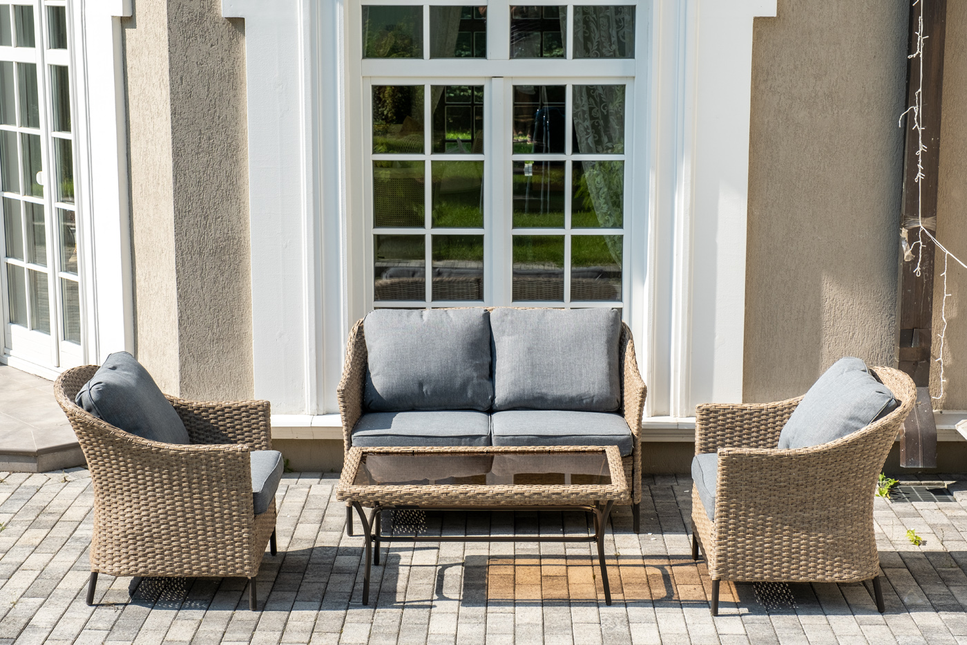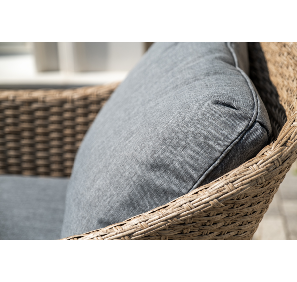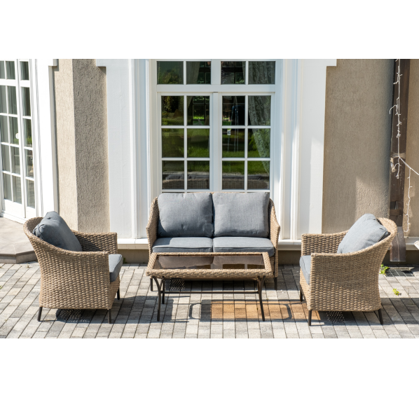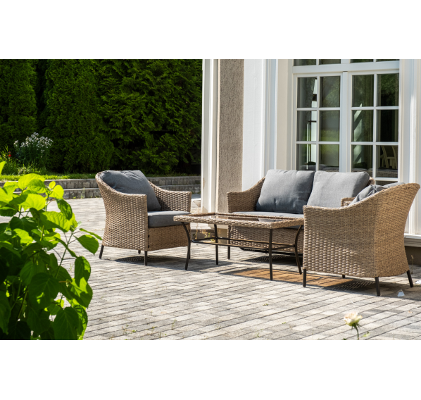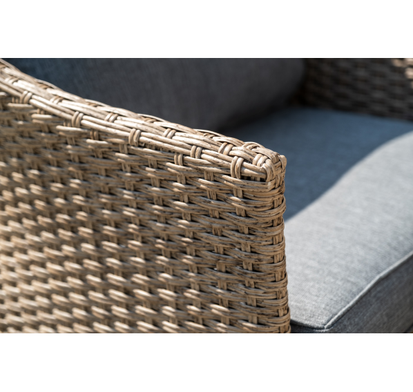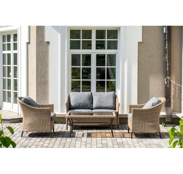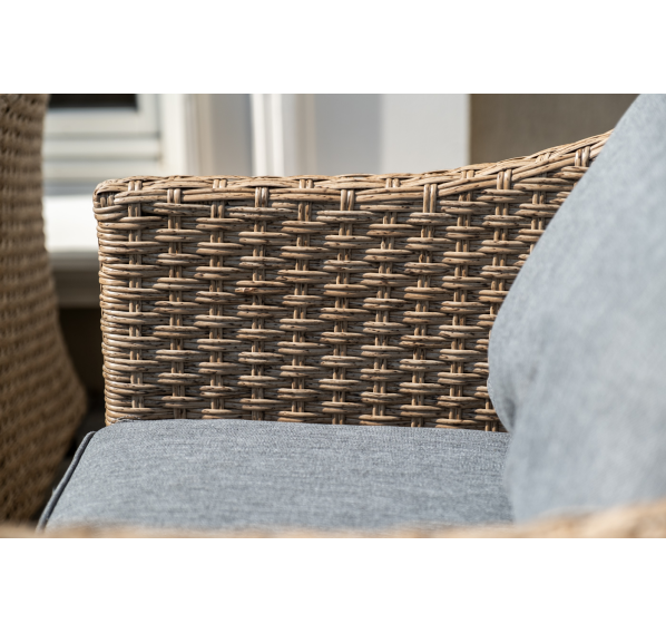 Оплетка выполнена вручную искусственным ротангом соломенного цвета, диван и кресла укомплектованы подушками из 100% полиэстера.