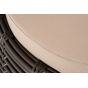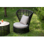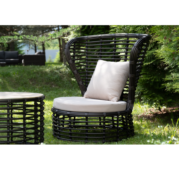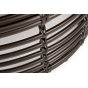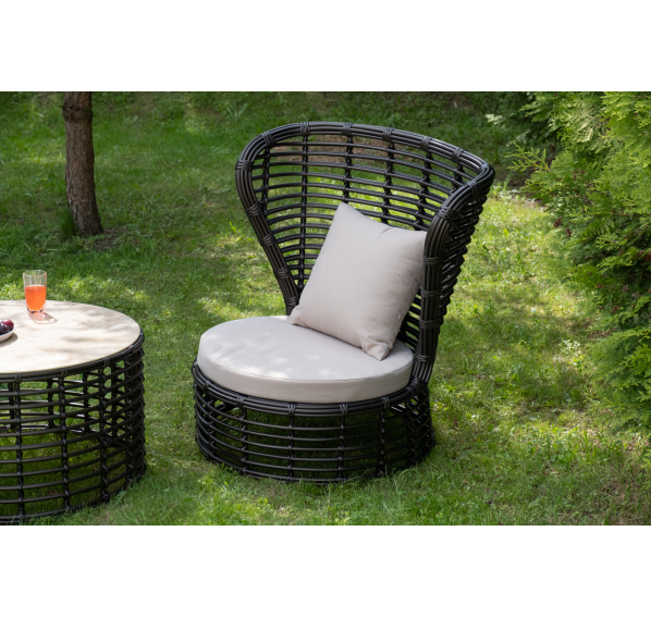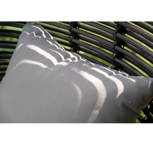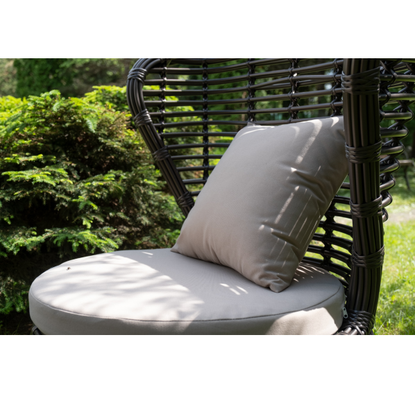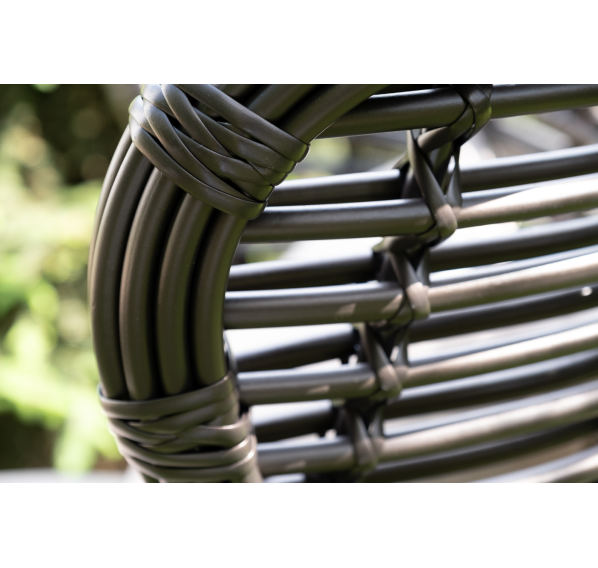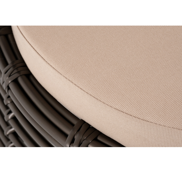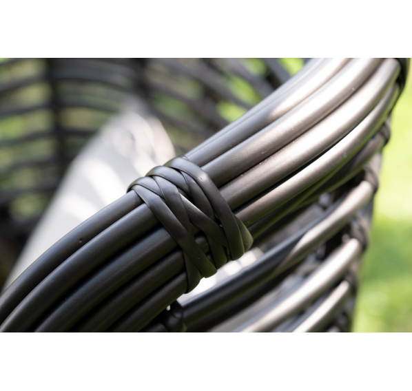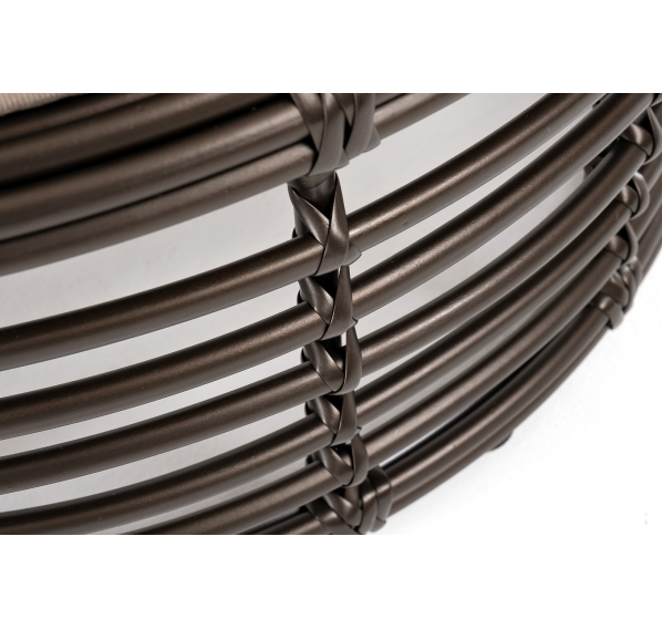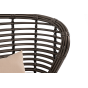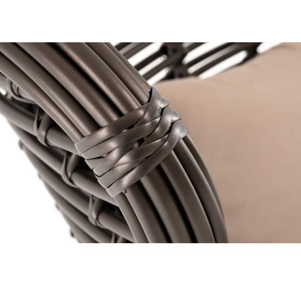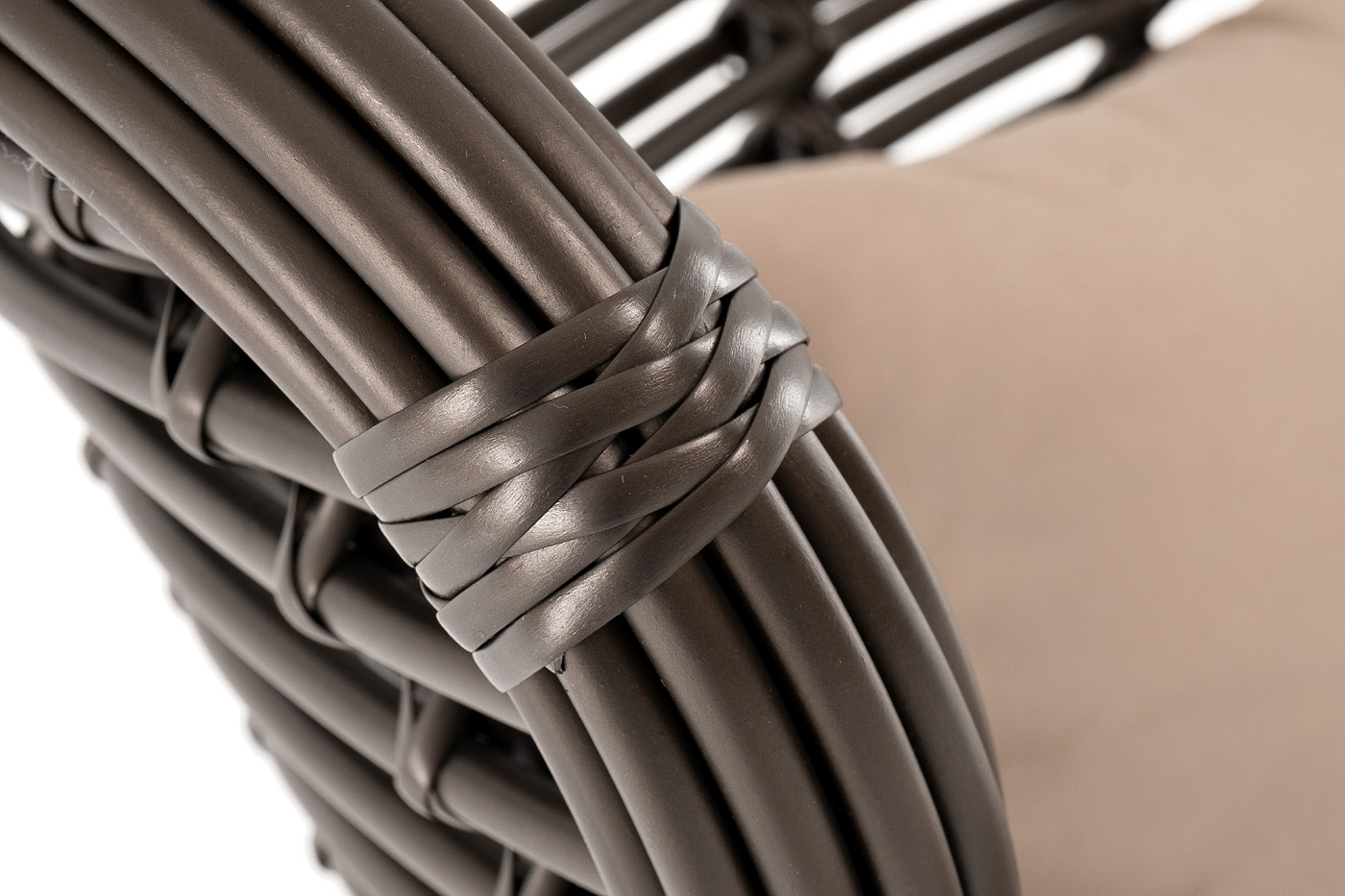 Плетение выполнено вручную круглым искусственным ротангом бронзового цвета, кресло укомплектовано подушками из 100% полиэстера, которые пропитаны специальным составом, обладающим влагоотталкивающим свойством.