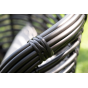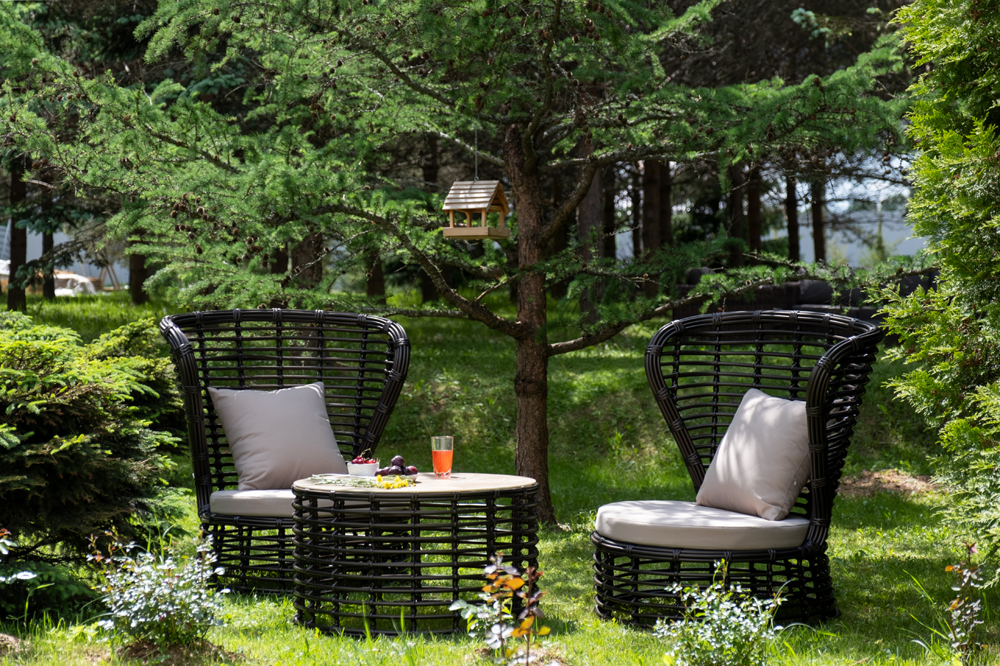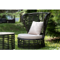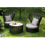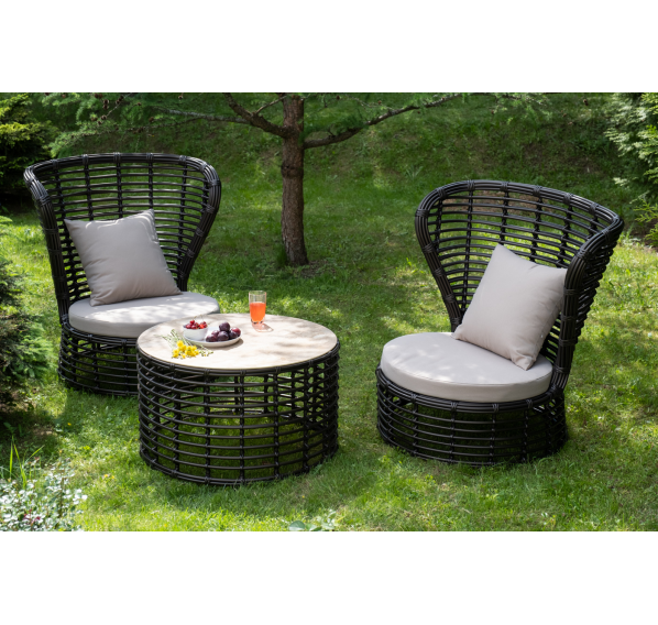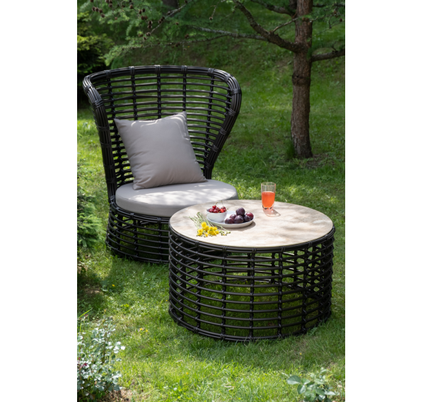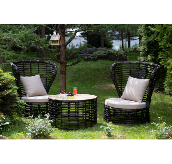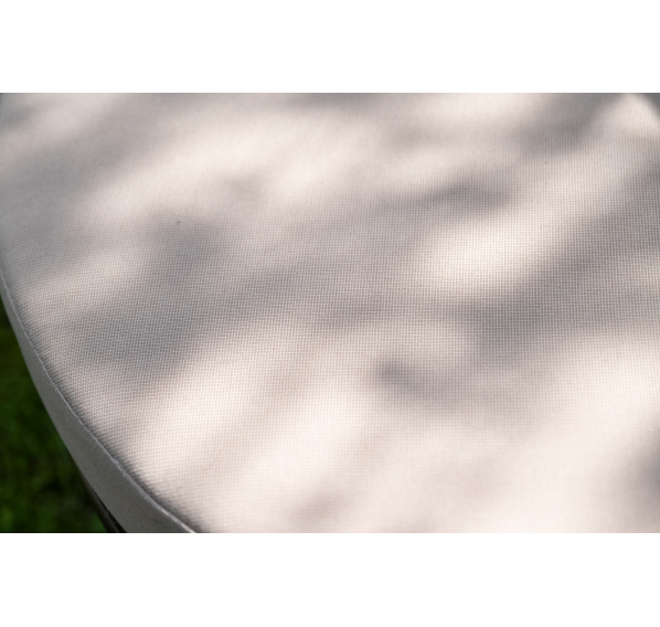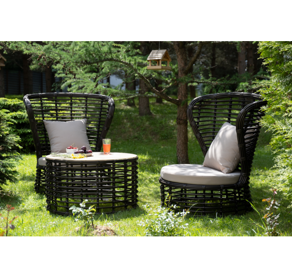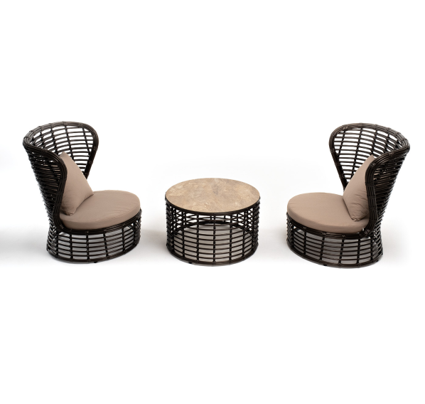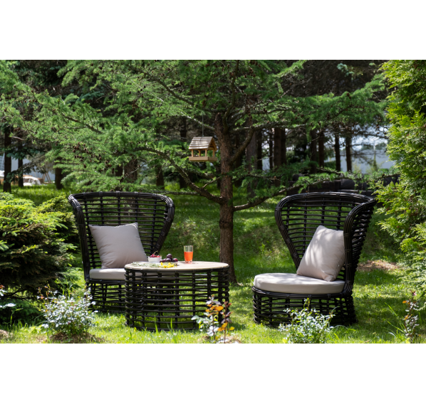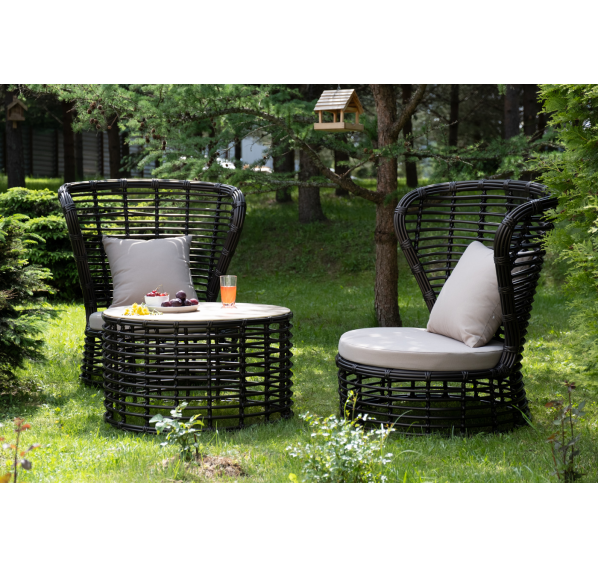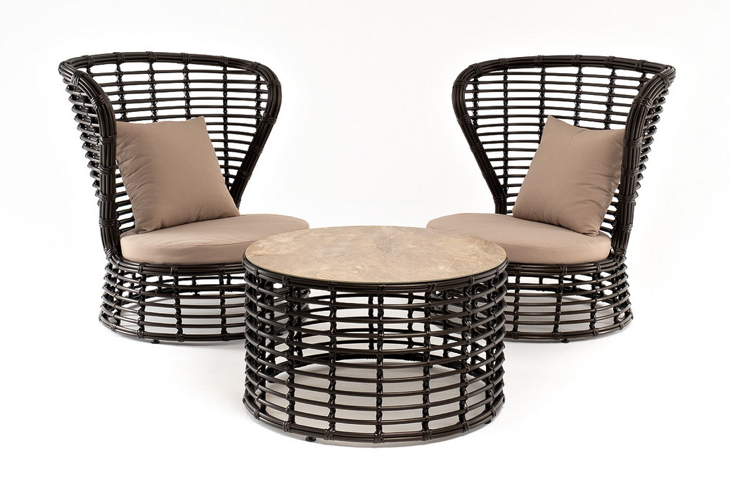 Плетение выполнено вручную круглым искусственным ротангом бронзового цвета, кресло укомплектовано подушками из 100% полиэстера, которые пропитаны специальным составом, обладающим влагоотталкивающим свойством.