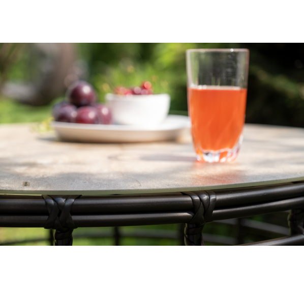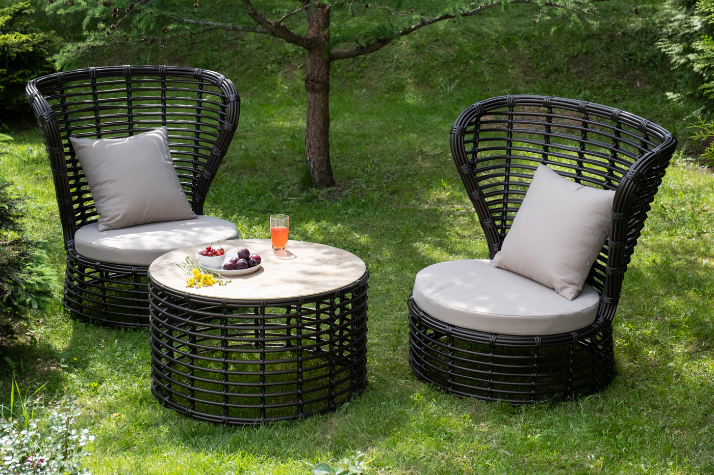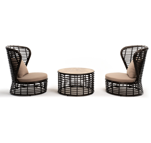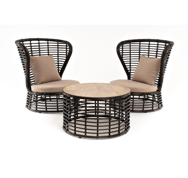 Кофейный комплект «Парма» рассчитан на 2 персоны и подходит для расположения на балконе, в небольших гостиных, на террасе и других местах с ограниченным пространством. В основе каркас из алюминия.