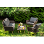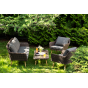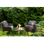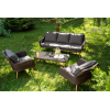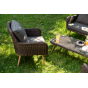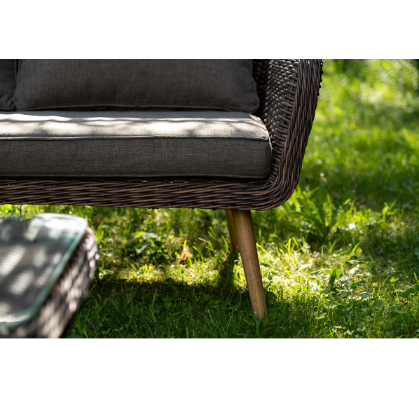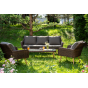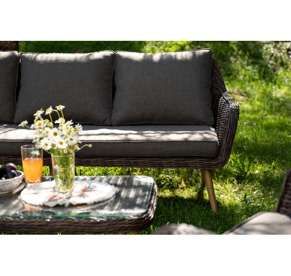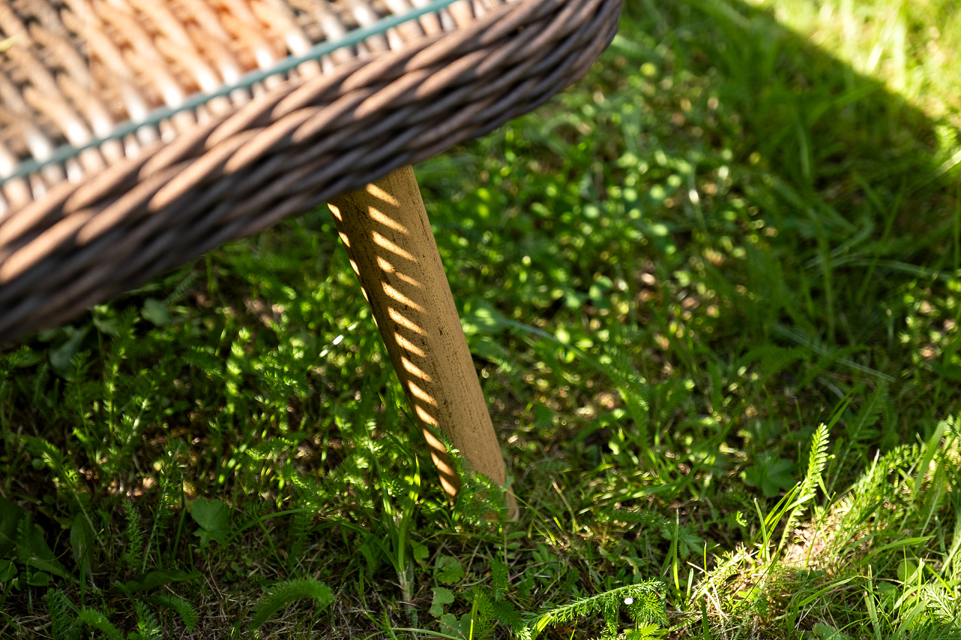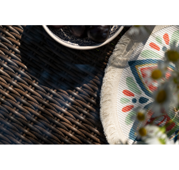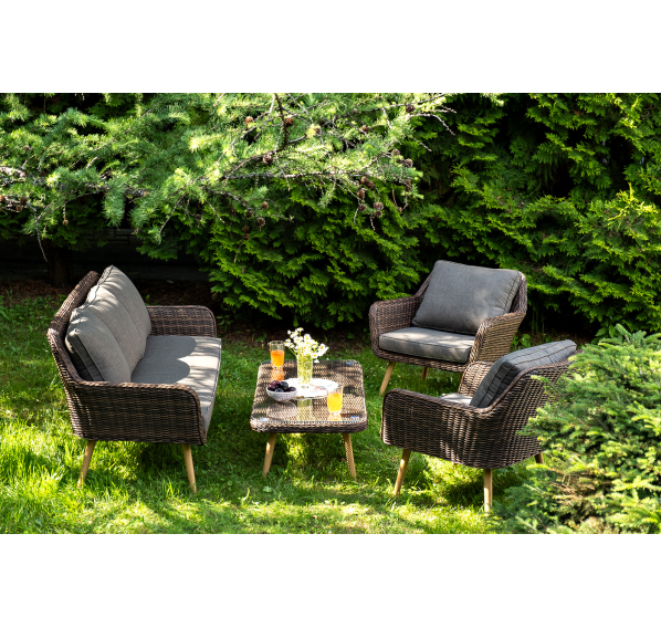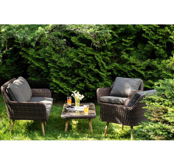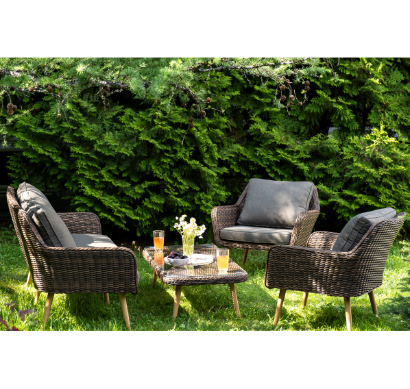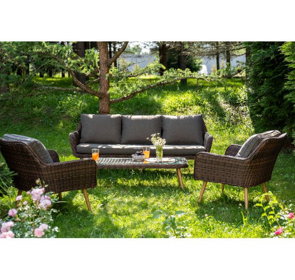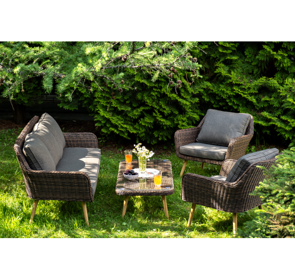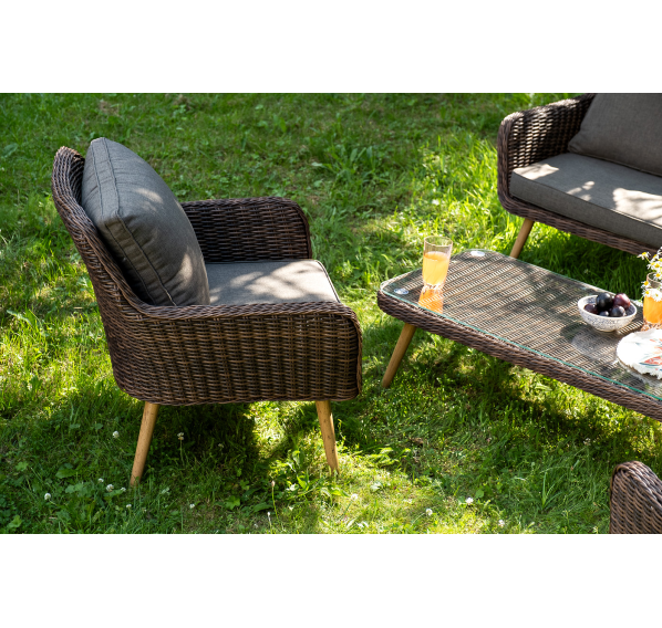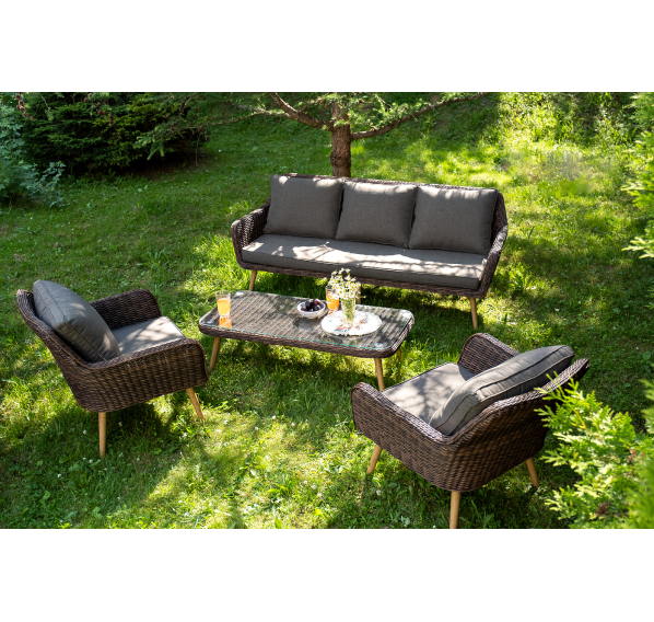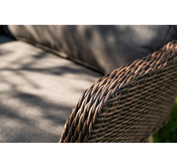 Каркас всей группы выполнен из прочного алюминия, который оплетен круглым искусственным ротангом. Цвет – коричневый.