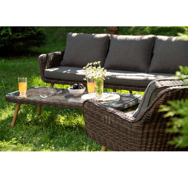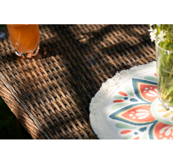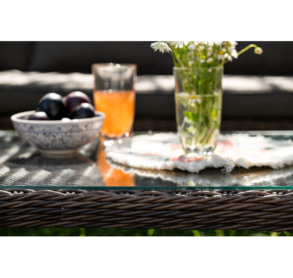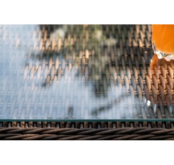 Плетеный столик укомплектован столешницей из закаленного стекла, толщиной – 5 мм.