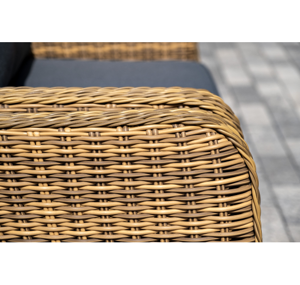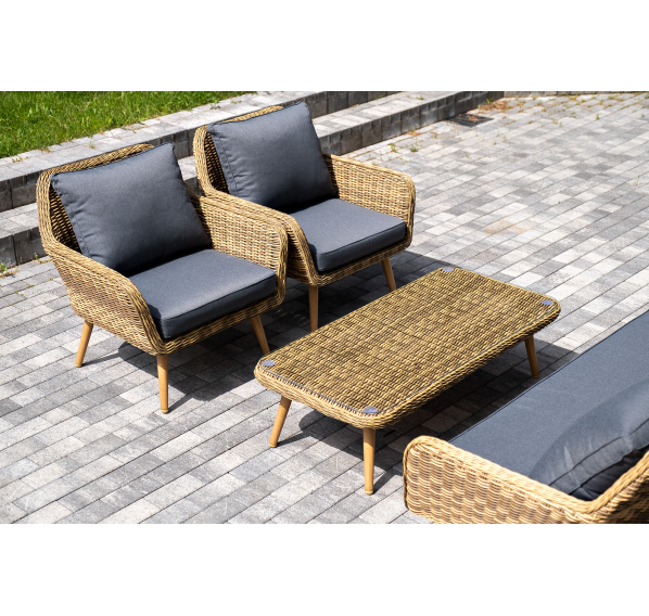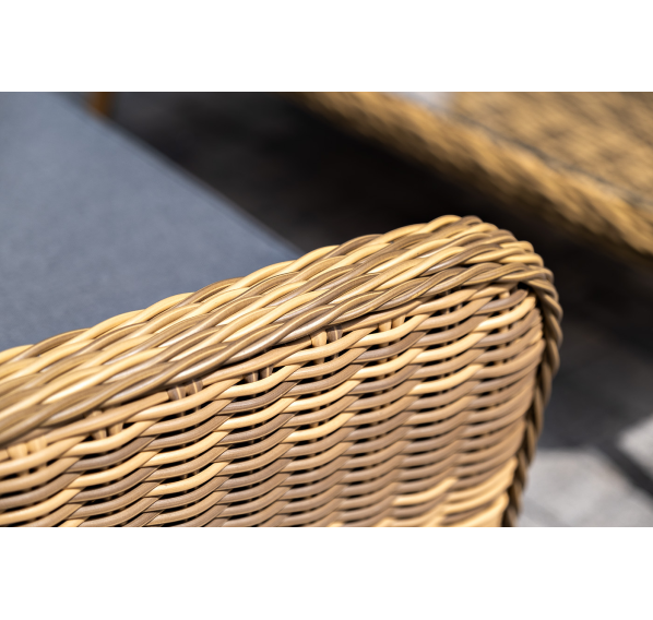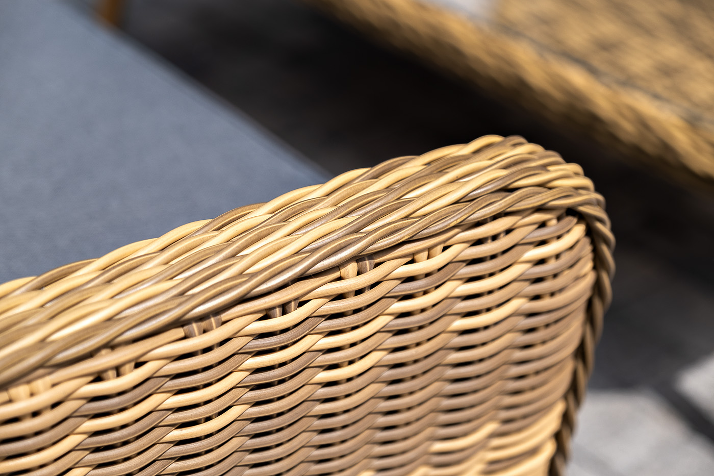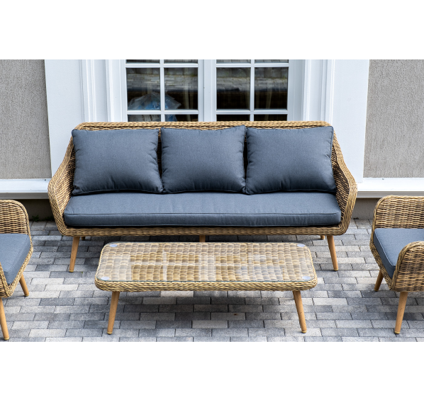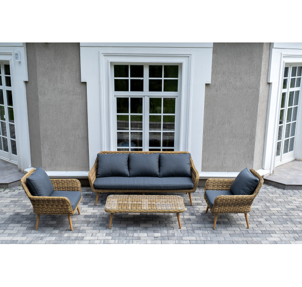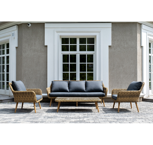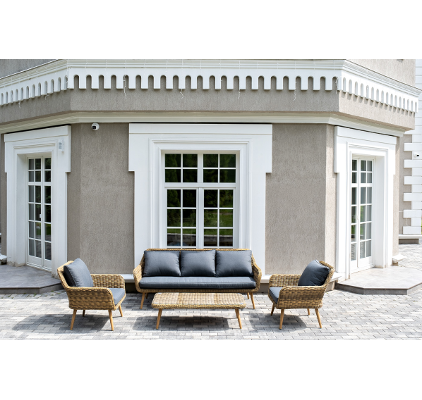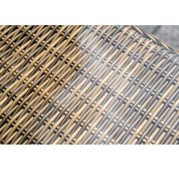Каркас всей группы выполнен из прочного алюминия, который оплетен круглым искусственным ротангом. Цвет – соломенный.