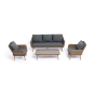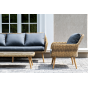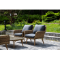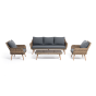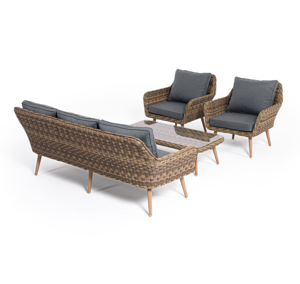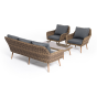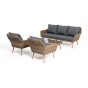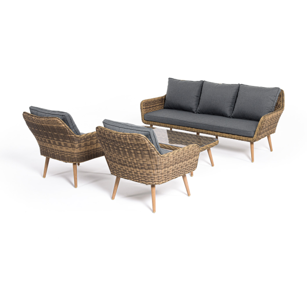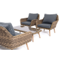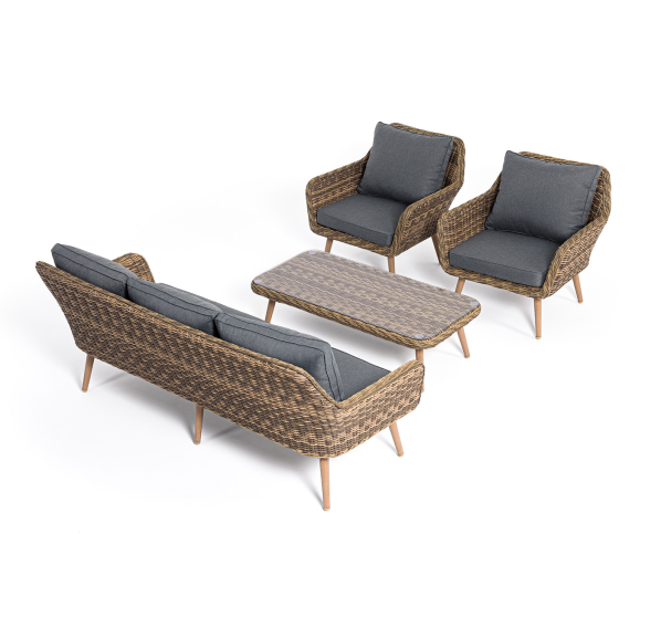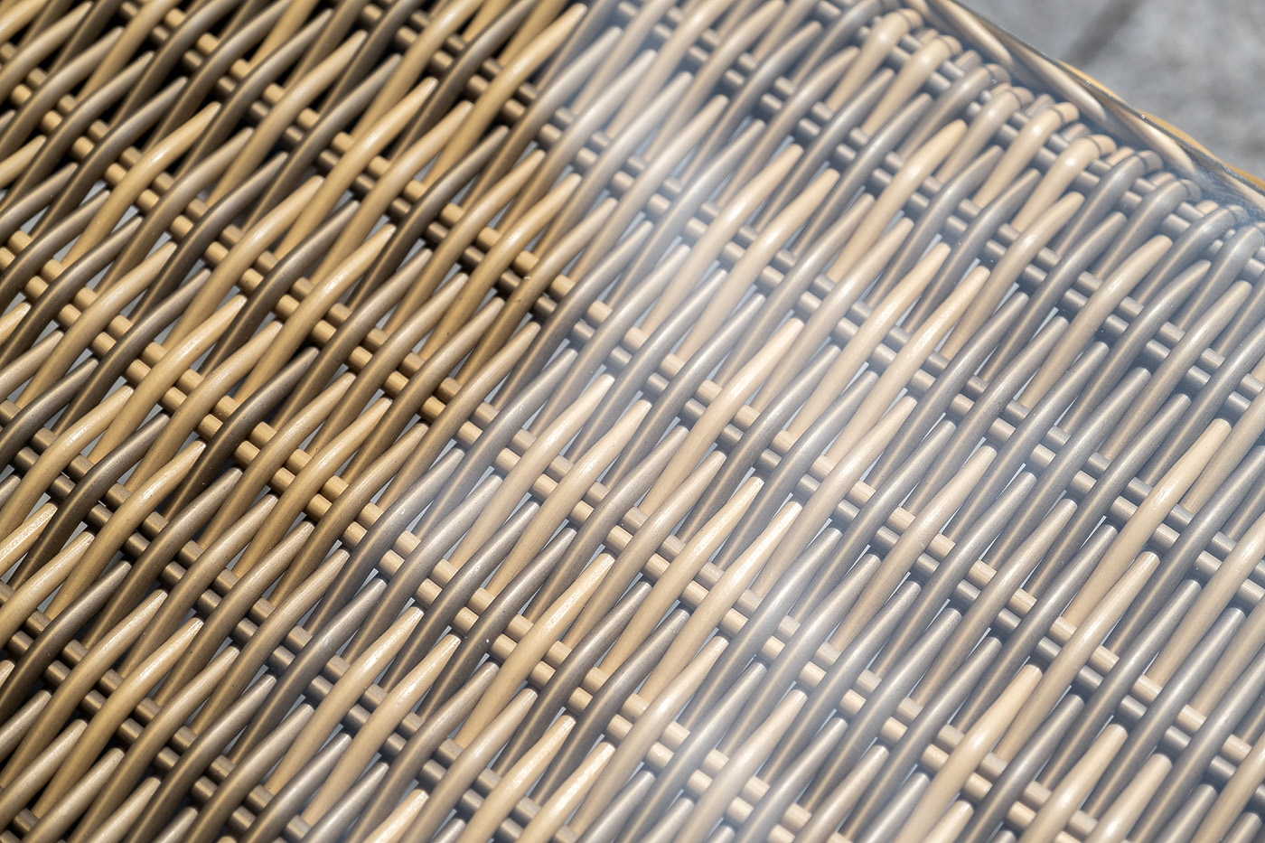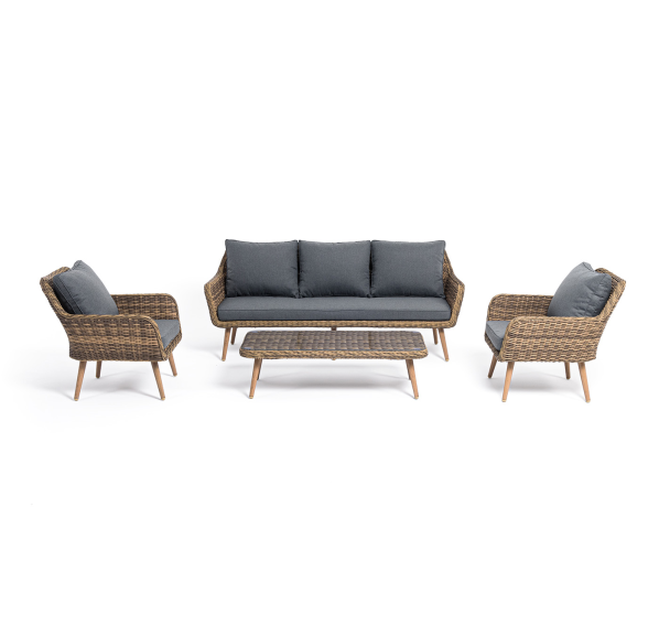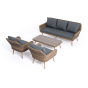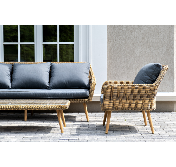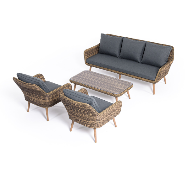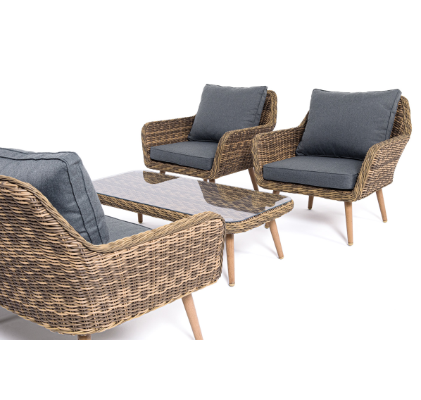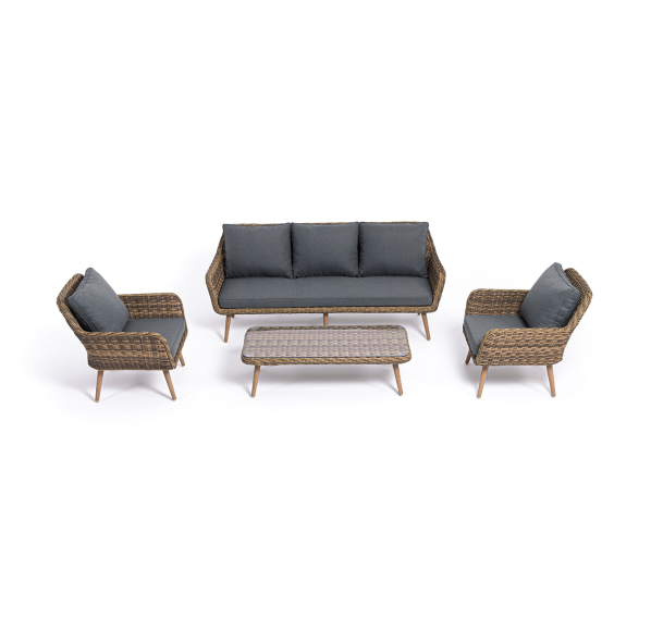 Каркас всей группы выполнен из прочного алюминия, который оплетен круглым искусственным ротангом. Цвет – соломенный.