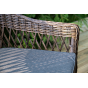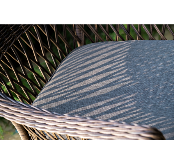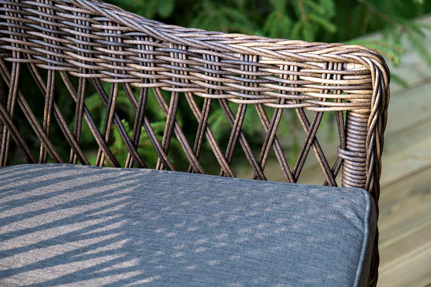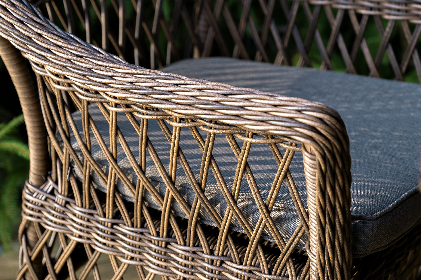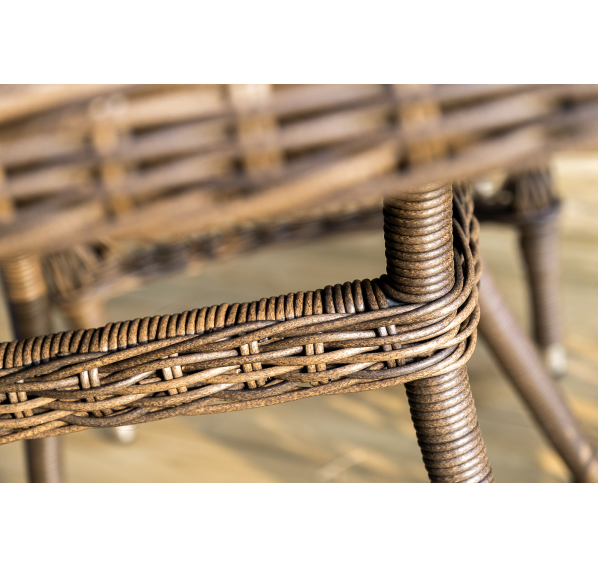 Мебель имеет надежный каркас из легкого алюминия. Изделия дополнительно оплетены ручным методом круглым искусственным ротангом натурального коричневого цвета.