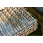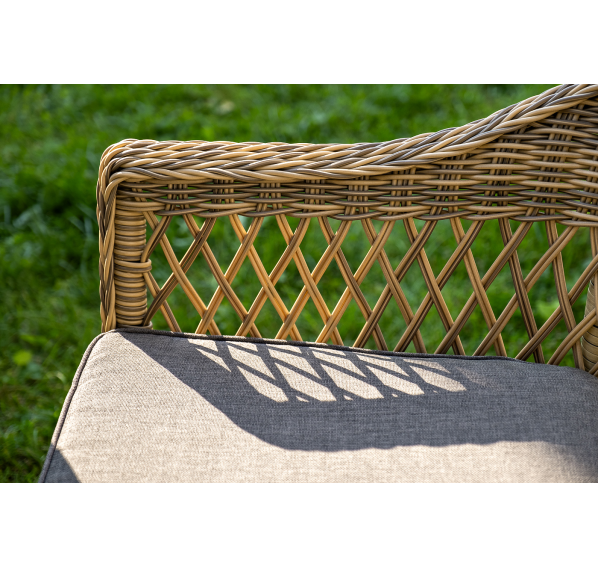 Мебель имеет надежный каркас из легкого алюминия. Изделия дополнительно оплетены ручным методом круглым искусственным ротангом натурального цвета соломы.