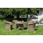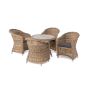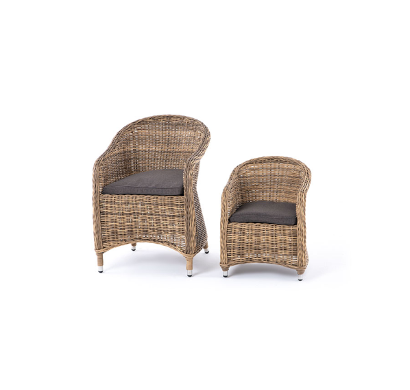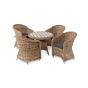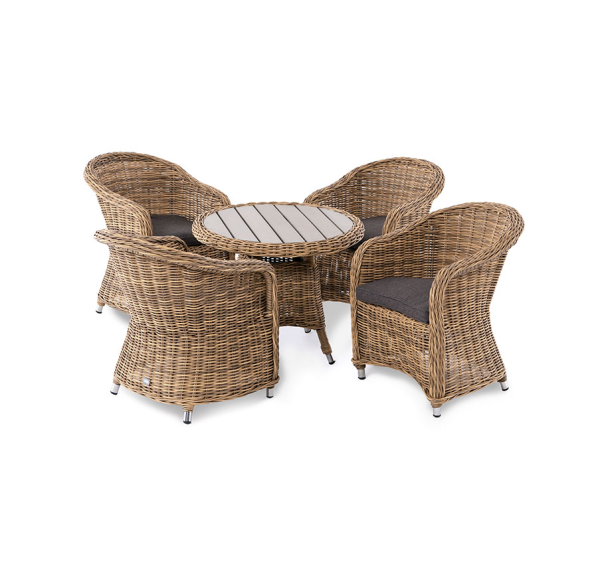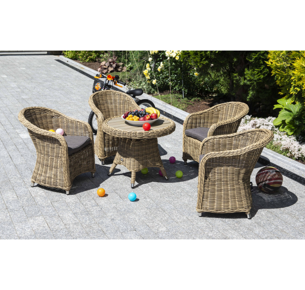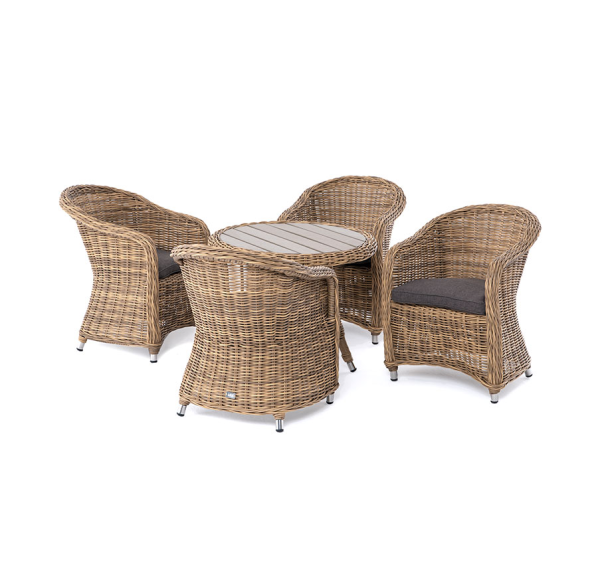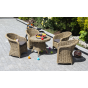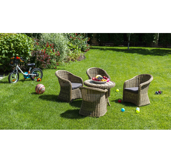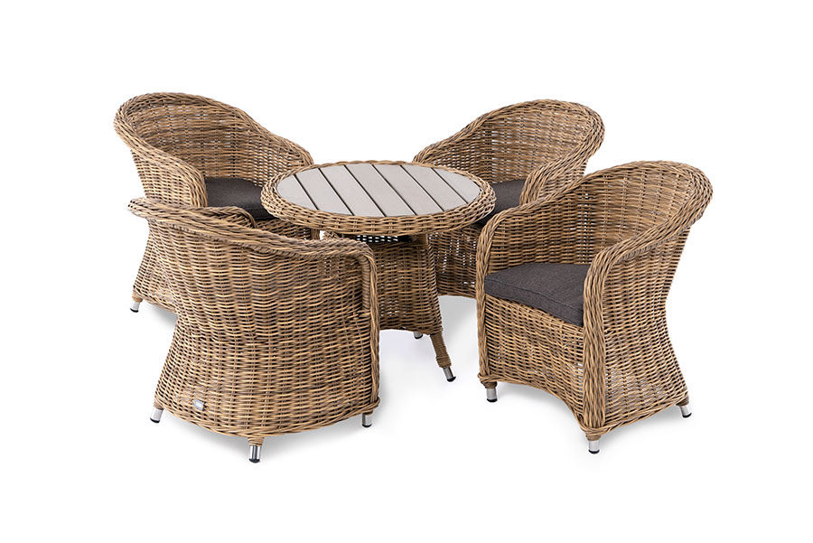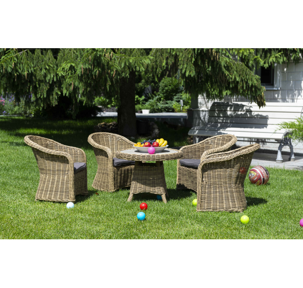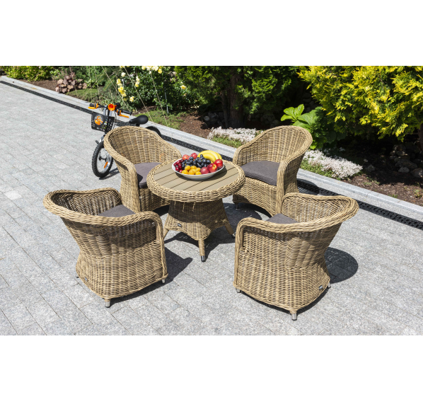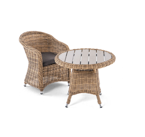 Каркас изготовлен из легкого алюминия, благодаря чему перемещать мебель сможет даже ребенок. В качестве декоративной оплетки использован искусственный ротанг, устойчивый к механическим повреждениях, ультрафиолету, атмосферным осадкам. Столешница изготовлена из долговечного композитного материала ДПК. Стулья укомплектованы подушками из влагостойкой полиэфирной ткани.