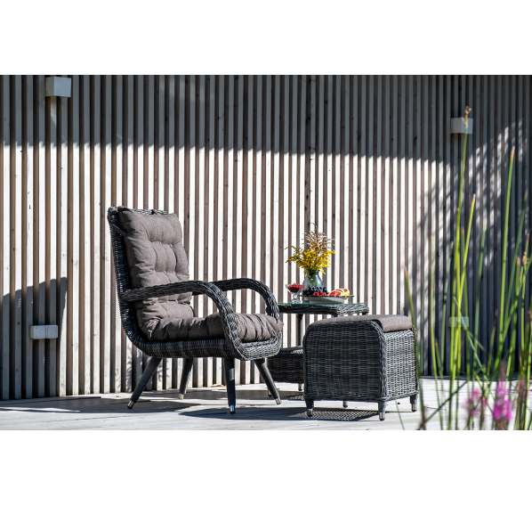 Кресло и пуф укомплектованы подушками со съёмными чехлами из влагостойкого 100%-го полиэстера.