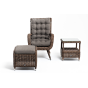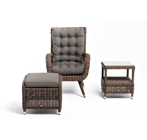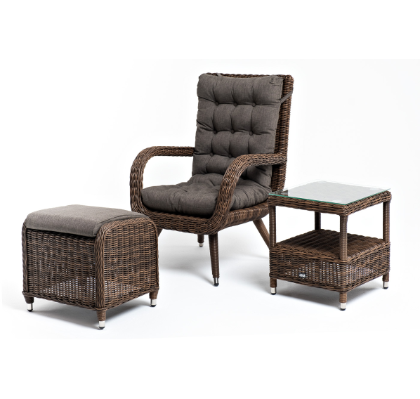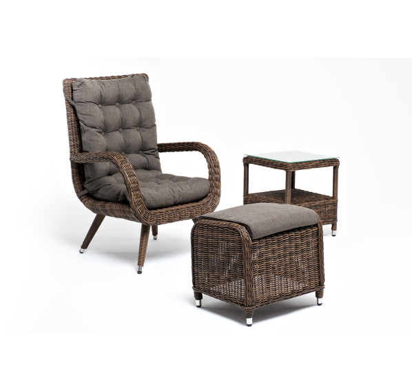 Кресло и пуф укомплектованы подушками со съёмными чехлами из влагостойкого 100%-го полиэстера.