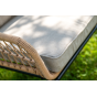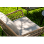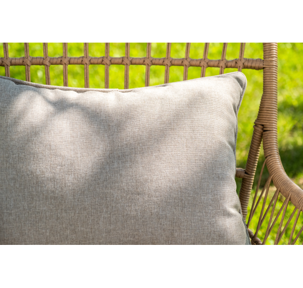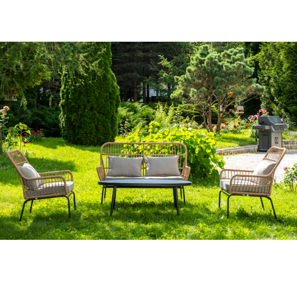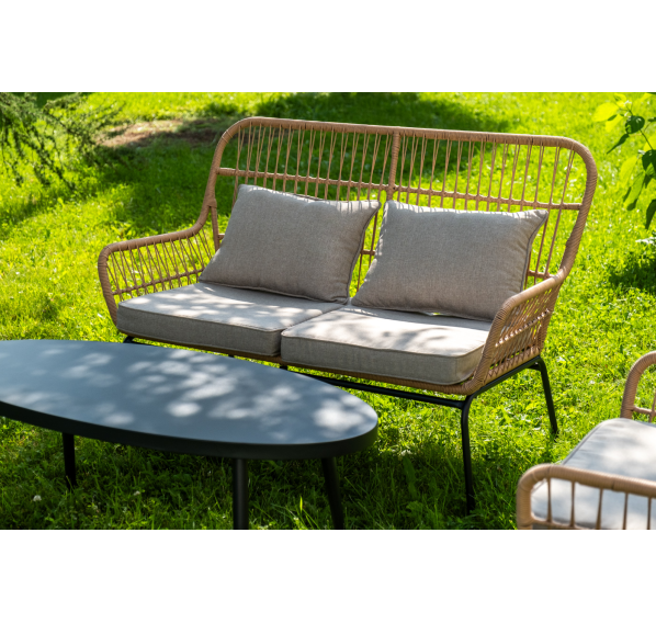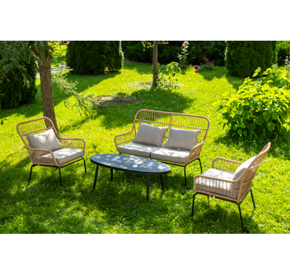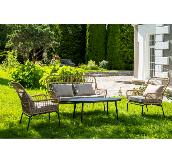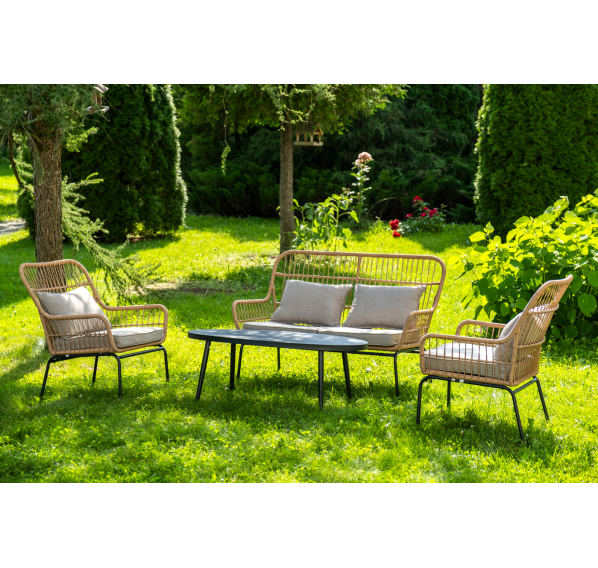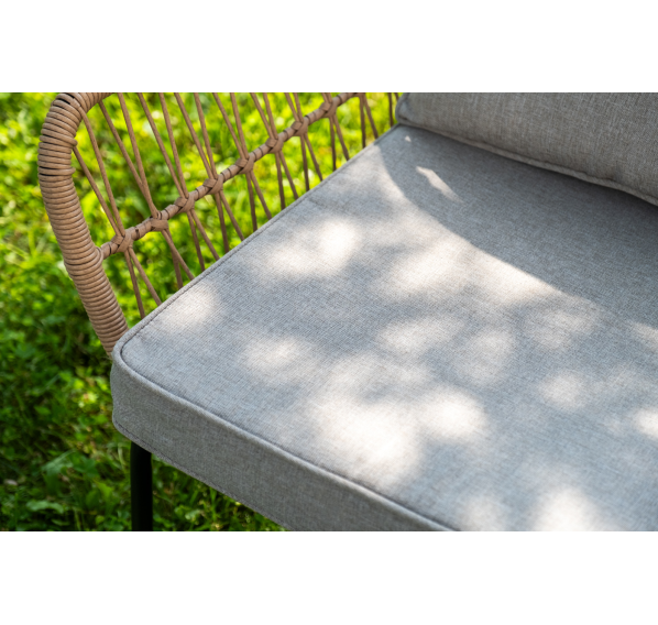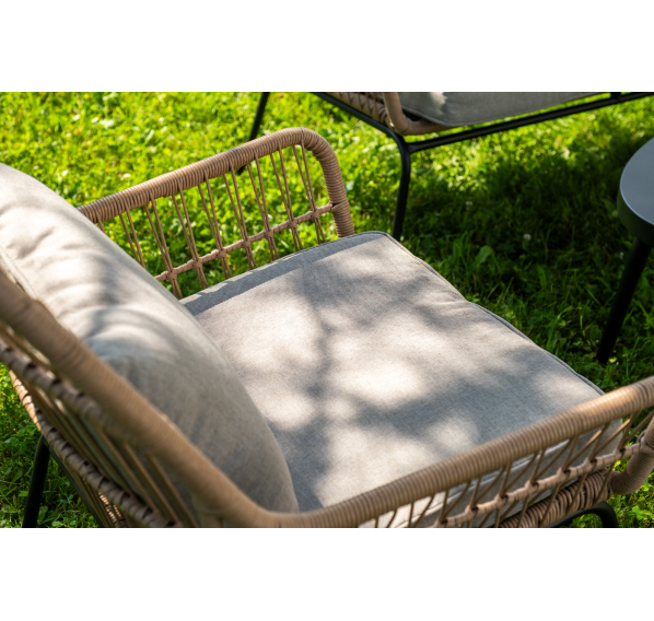 Оплетка выполнена вручную искусственным ротангом соломенного цвета, диван и кресла укомплектованы подушками из 100% полиэстера бежевого цвета.