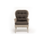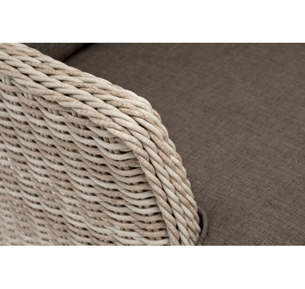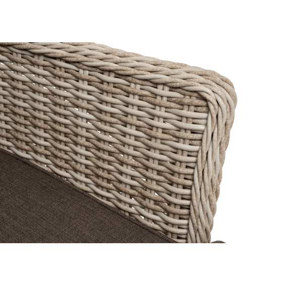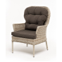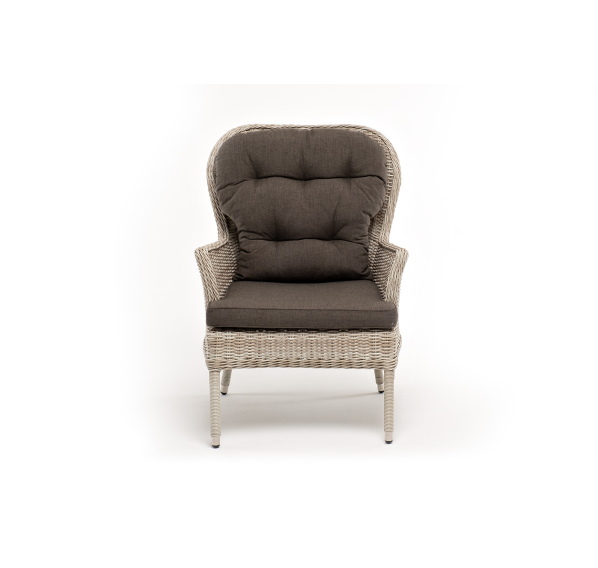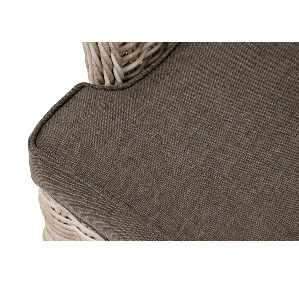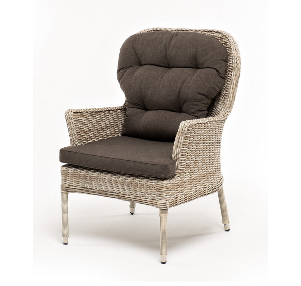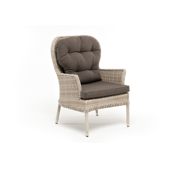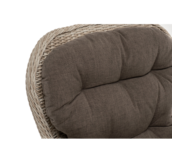 В садовое кресло укомплектовывается мягкими подушками. Они пошиты из износостойкого полиэстера серого оттенка с плотностью 300гр/м2. Защитные свойства синтетического материала усиливаются благодаря влагоотталкивающей пропитке.