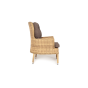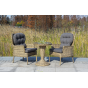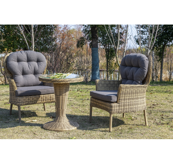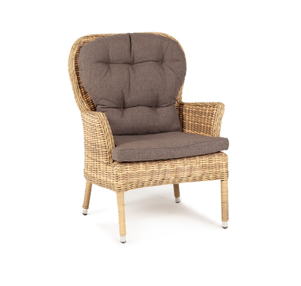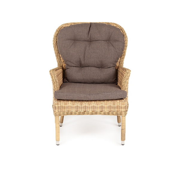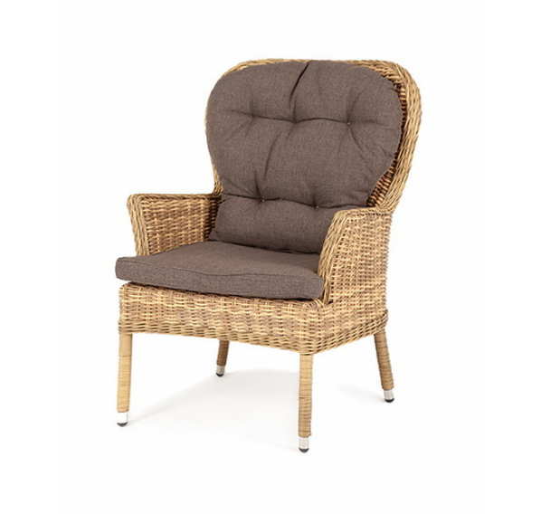 В садовое кресло укомплектовывается мягкими подушками. Они пошиты из износостойкого полиэстера серого оттенка с плотностью 300гр/м2. Защитные свойства синтетического материала усиливаются благодаря влагоотталкивающей пропитке.