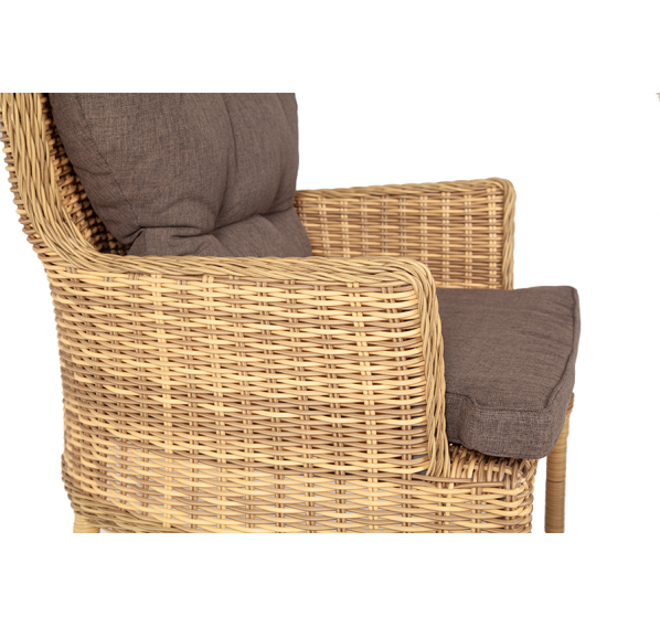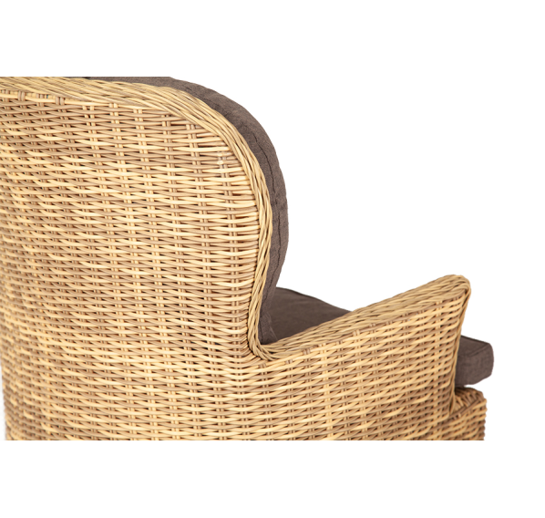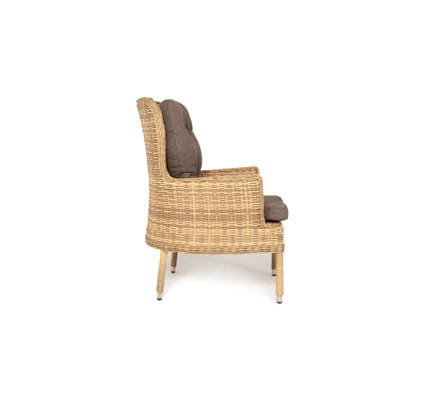 Каркас выполнен из высококачественного алюминия, который оплетен круглым искусственным ротангом соломенного цвета.