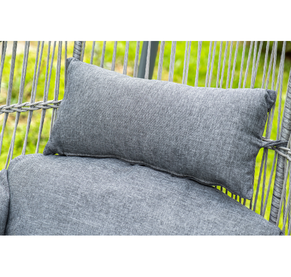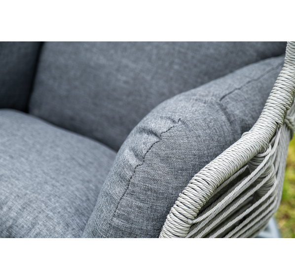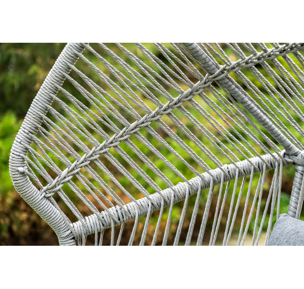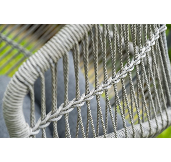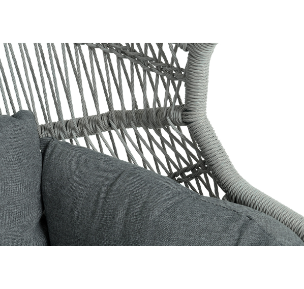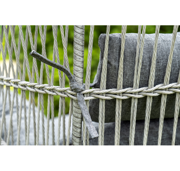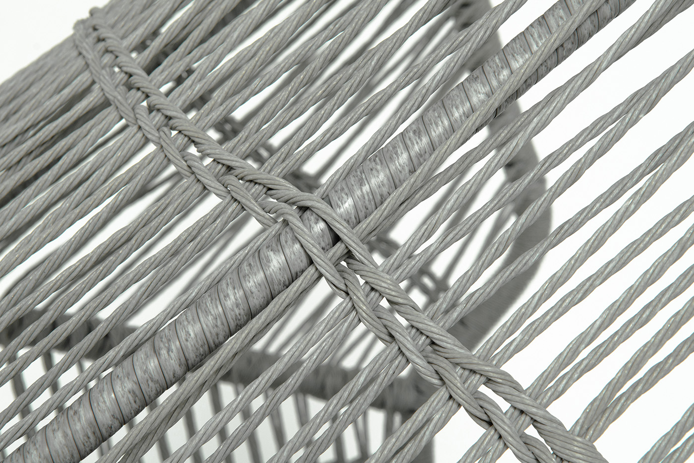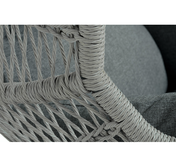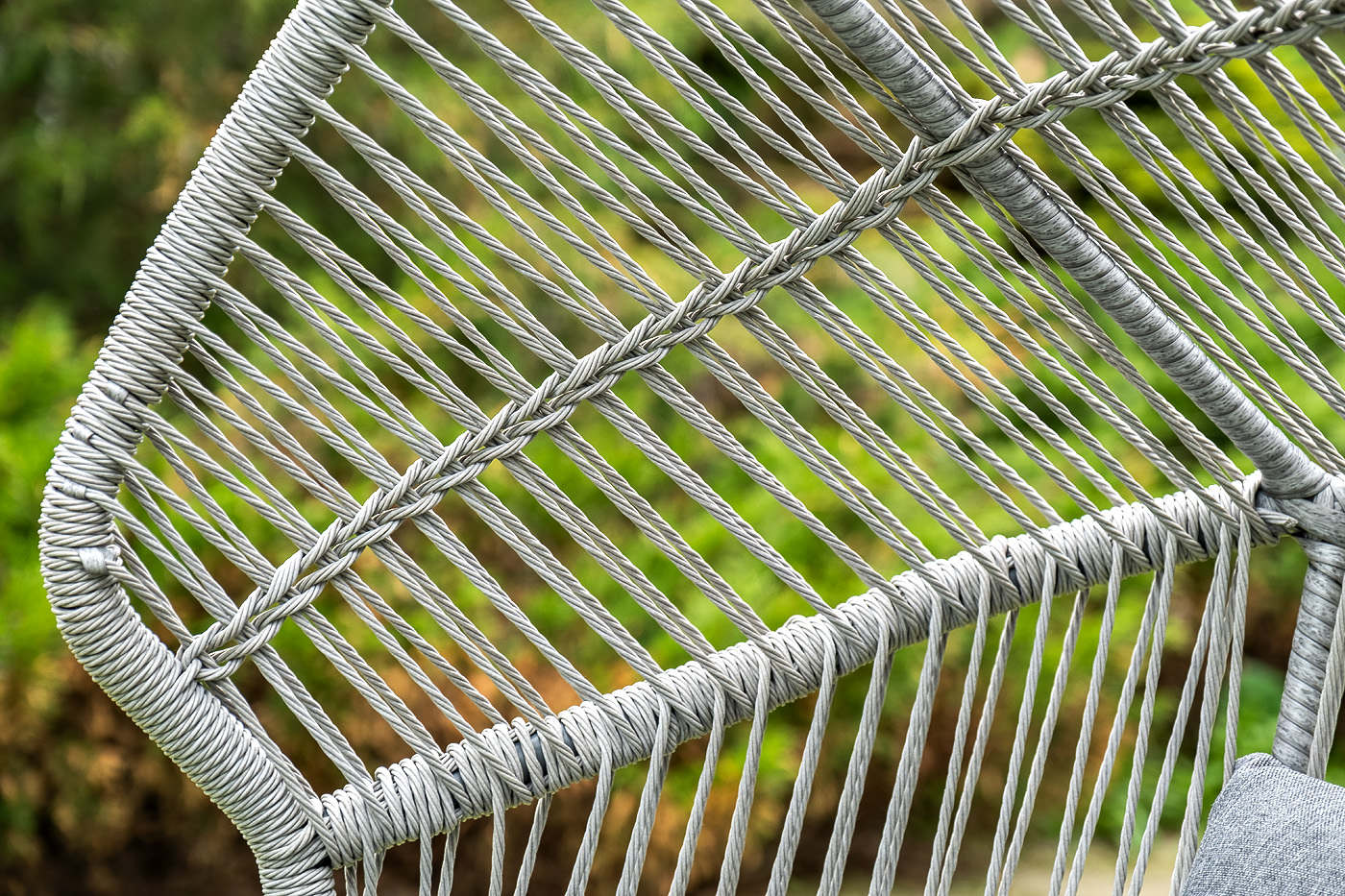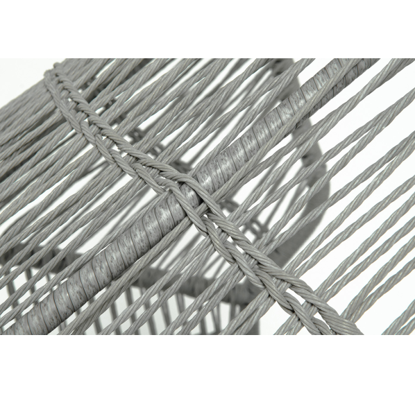 Каркас изготовлен из стали, окрашенного порошковой износостойкой краской серого цвета. Оплетка – плоский искусственный ротанг серого оттенка. Материал устойчив к перепадам погоды и подходит для использования на открытых пространствах.