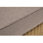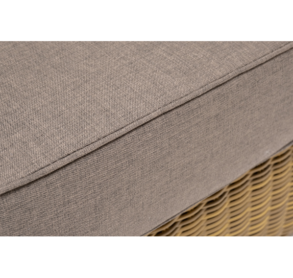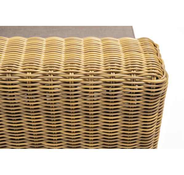 Кресло оснащено каркасом из прочного алюминия, ручное круглое плетение является основным декоративным элементом мебели. Оно выполнено из искусственного ротанга в соломенном цвете.