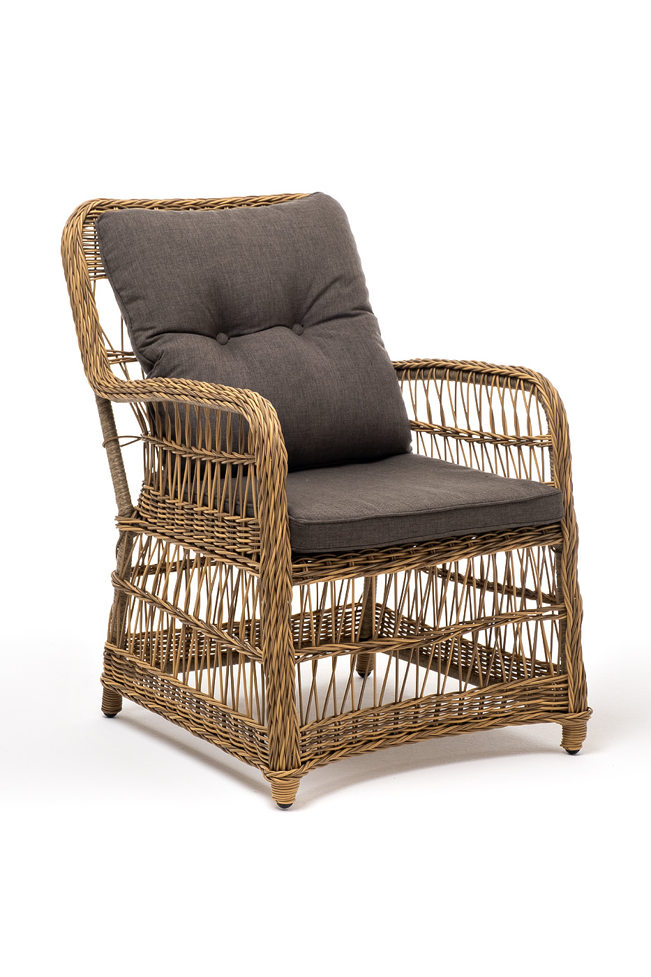 Садовое кресло располагает двумя мягкими подушками, которые идут в комплекте. Они выполнены в сером цвете. Полиэстер высокого качества используется при пошиве тканевых изделий. Его плотность 300гр/м2. Ткань обрабатывается влагоотталкивающей пропиткой.
