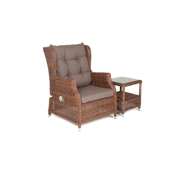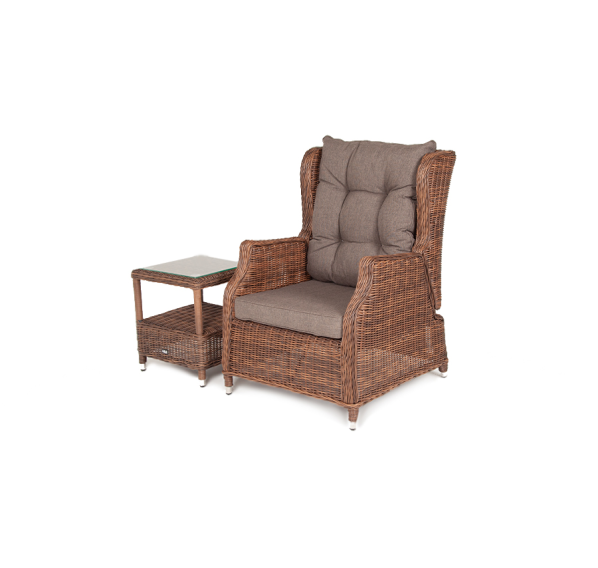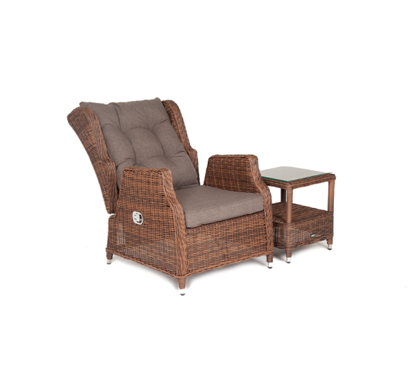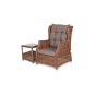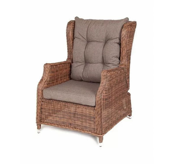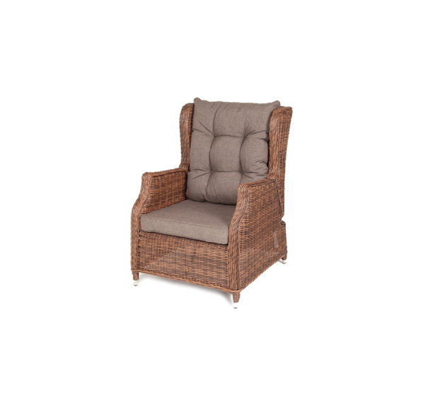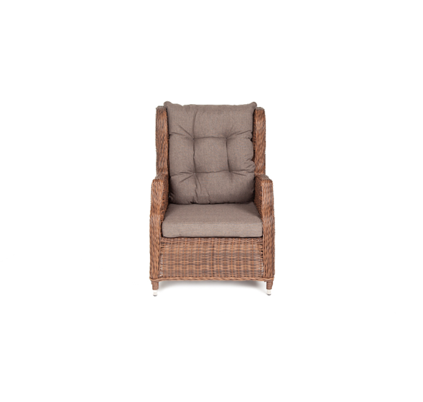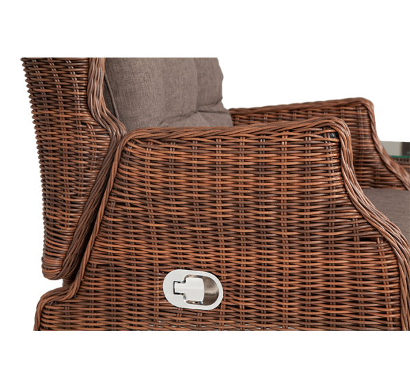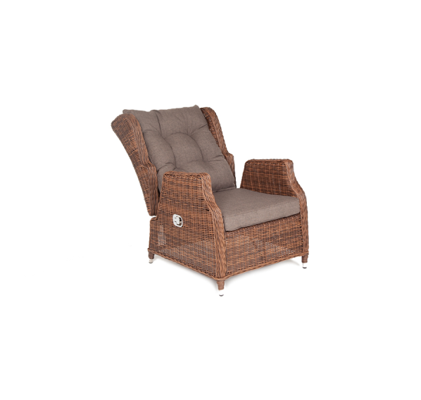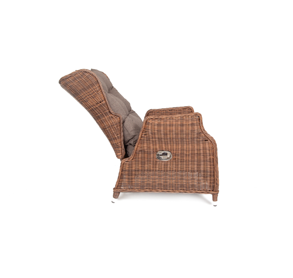 Кресло из искусственного ротанга «Форио» коричневого цвета, разработано с возможностью регулировки уровня наклона для индивидуального комфорта.