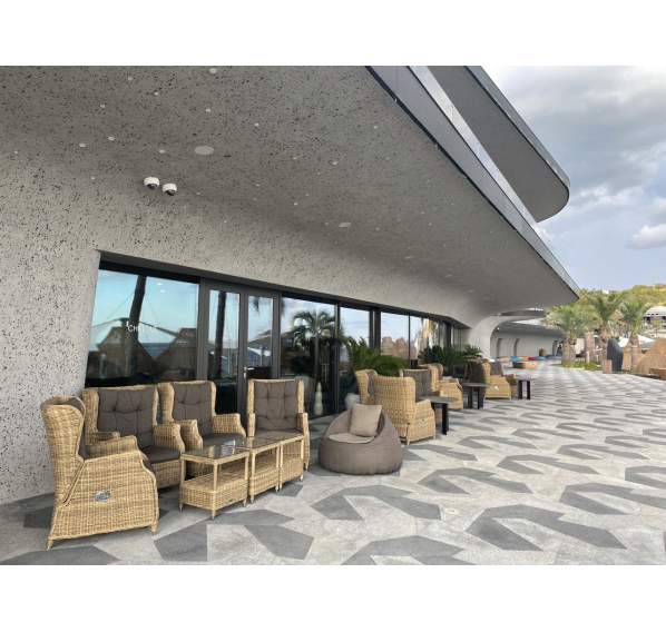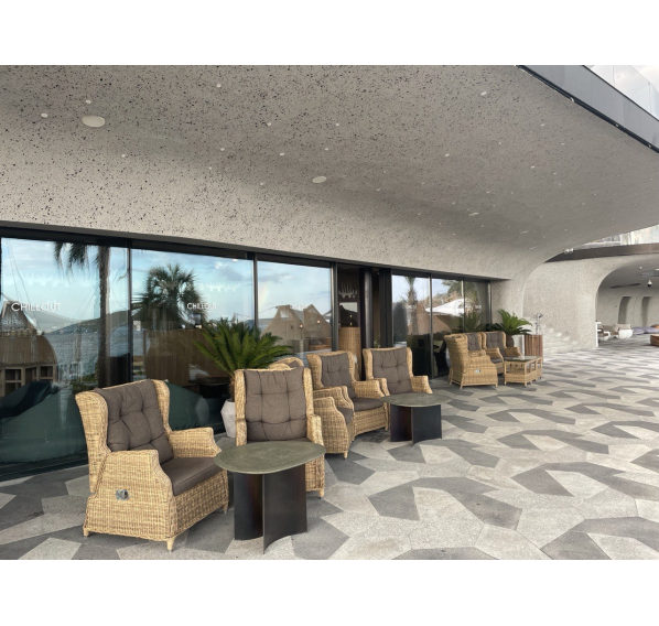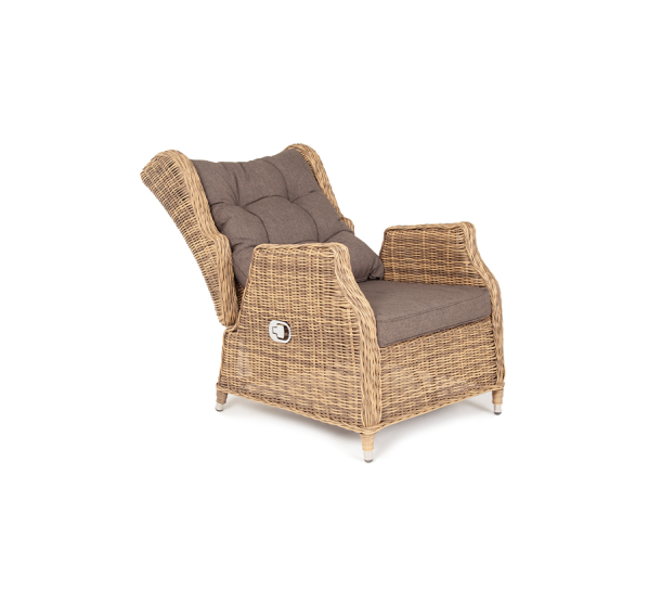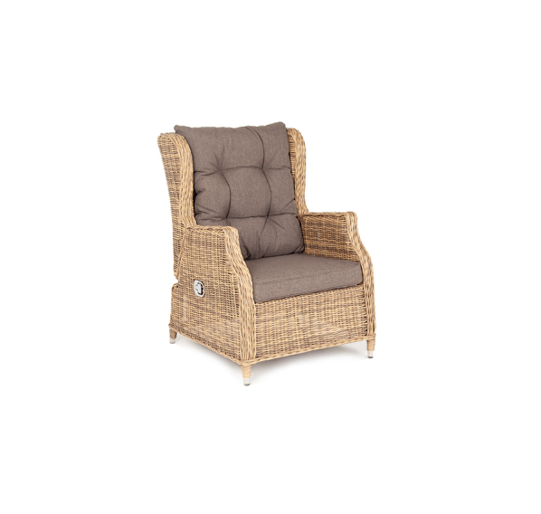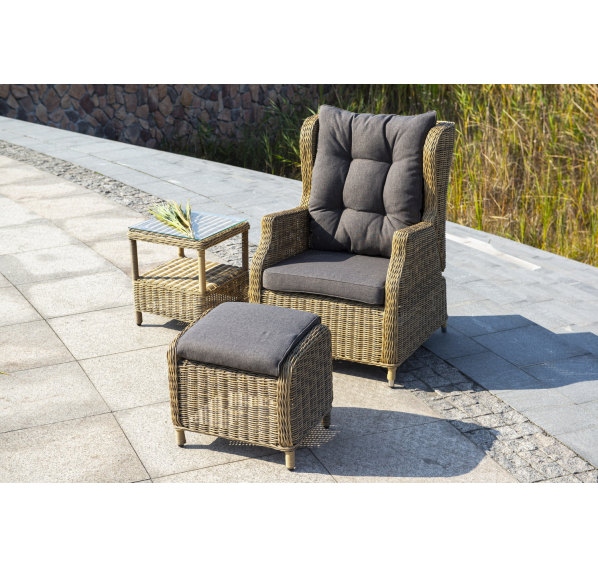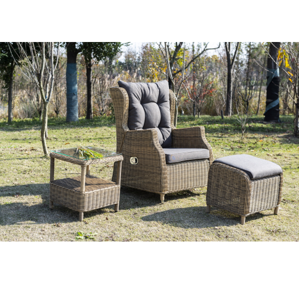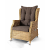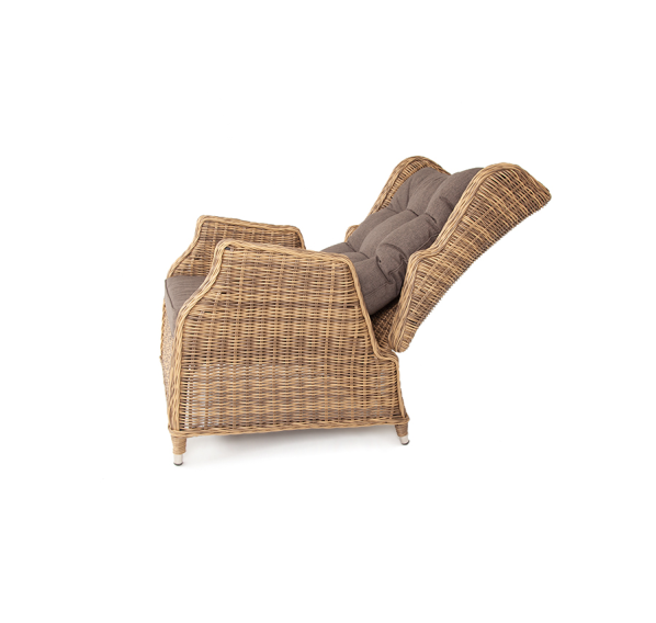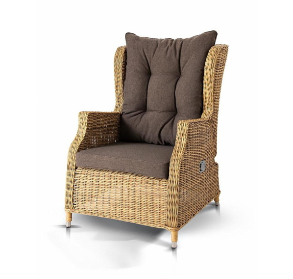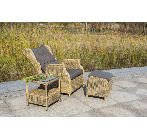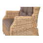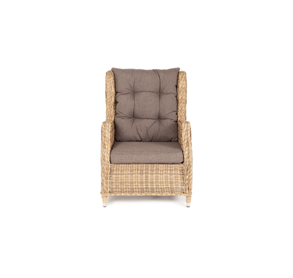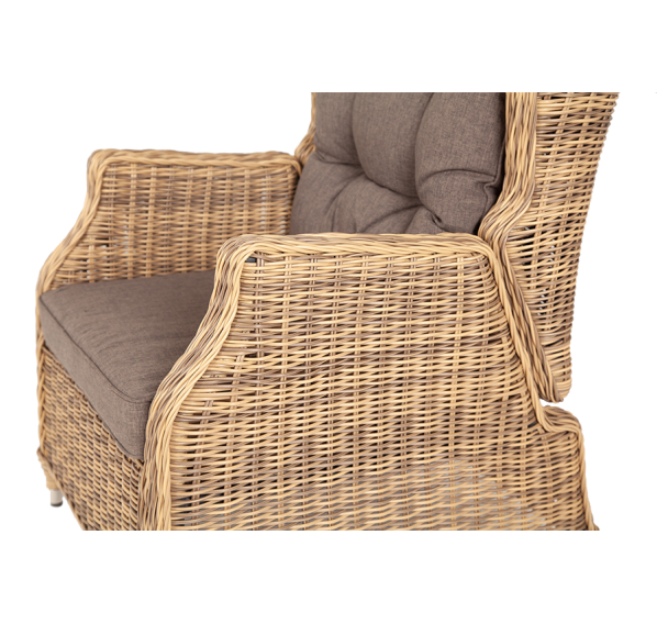 В основе мебели находится алюминиевый каркас высокой прочности, который оплетен круглым искусственным ротангом. Представлена в натуральном соломенном оттенке.