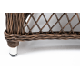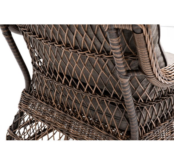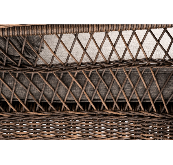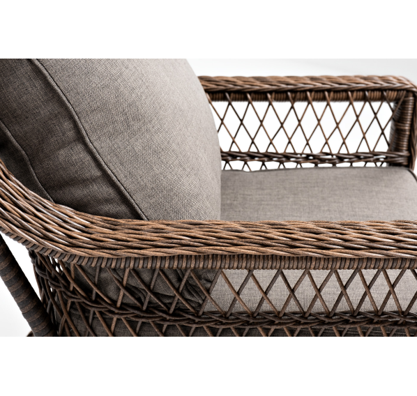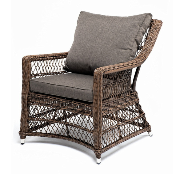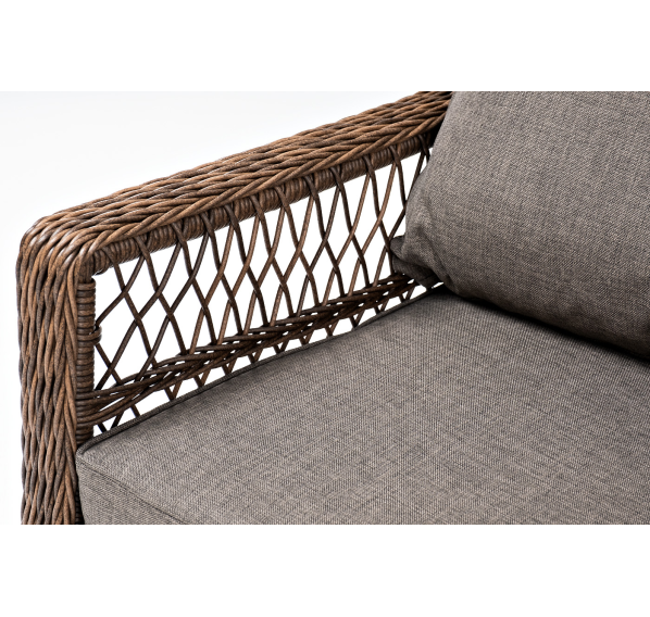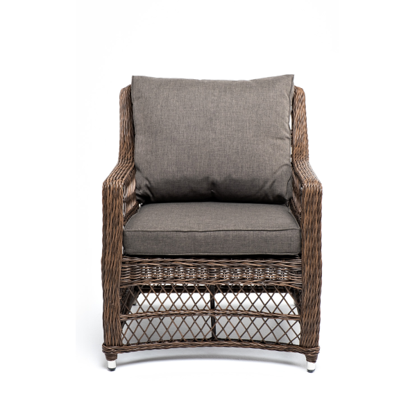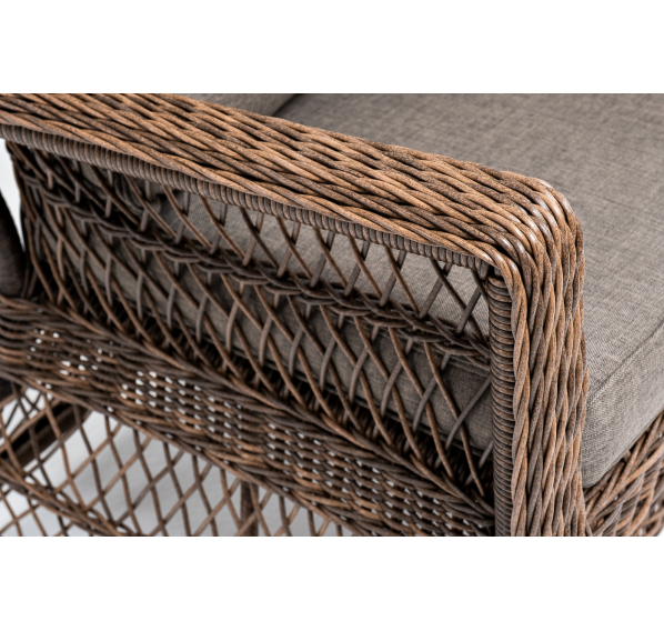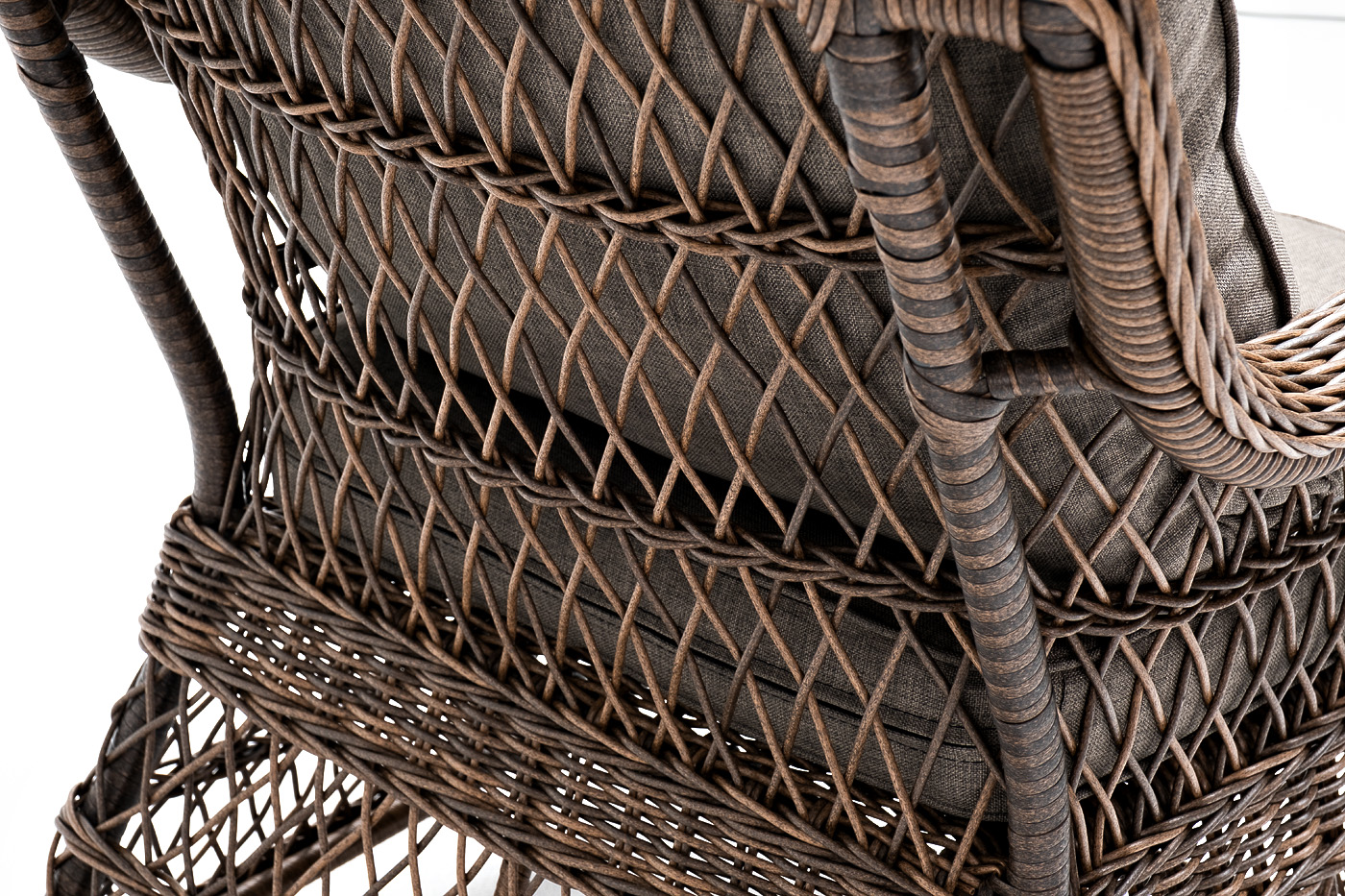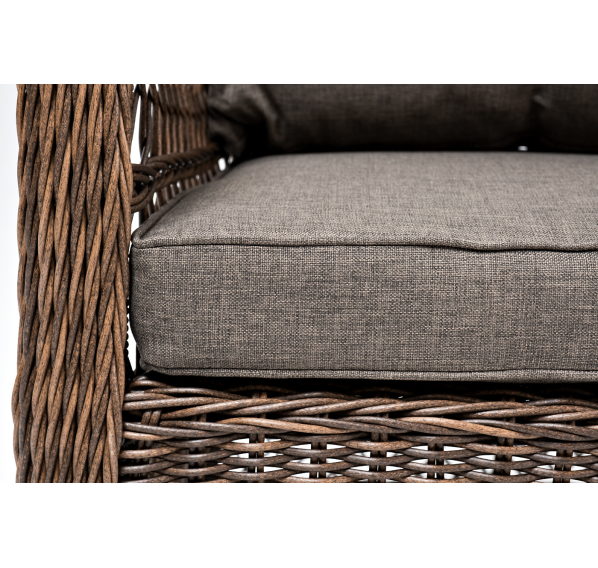 Укомплектовано плетеное кресло удобными мягкими подушками, одна из которых располагается в области спинки. Они выполнены в сером оттенке. При пошиве тканевых изделий используется полиэстер, плотностью 300гр/м2. Он в обязательном порядке проходит обработку влагоотталкивающей пропиткой.