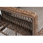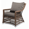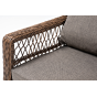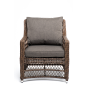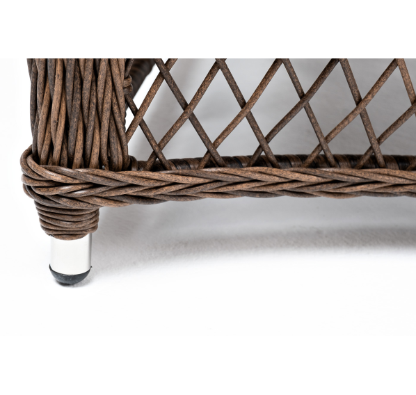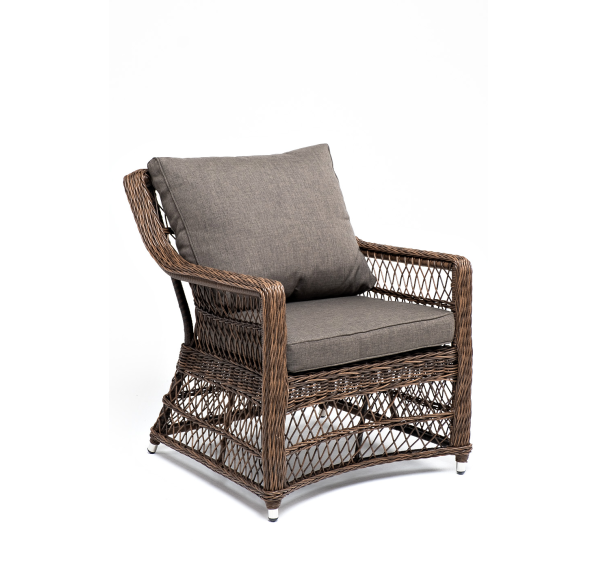 Кресло изготовлена из устойчивого алюминиевого каркаса. Искусственный ротанг украшает мебель в качестве круглого ручного плетения. Оно представлено в коричневом цвете.