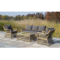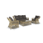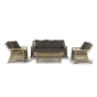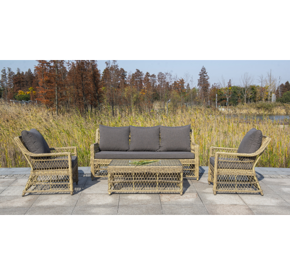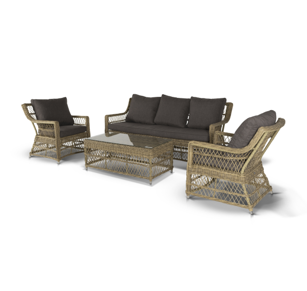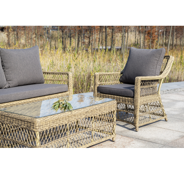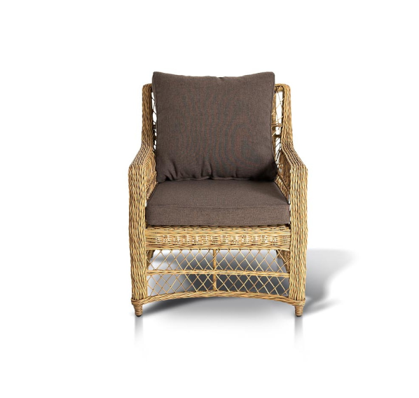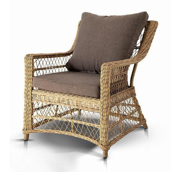 Укомплектовано плетеное кресло удобными мягкими подушками, одна из которых располагается в области спинки. Они выполнены в сером оттенке. При пошиве тканевых изделий используется полиэстер, плотностью 300гр/м2. Он в обязательном порядке проходит обработку влагоотталкивающей пропиткой.
