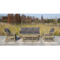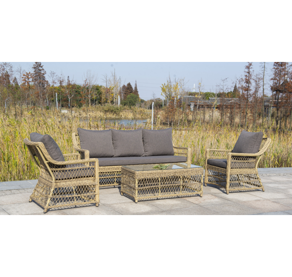 Кресло изготовлена из устойчивого алюминиевого каркаса. Искусственный ротанг украшает мебель в качестве круглого ручного плетения. Оно представлено в соломенном цвете.