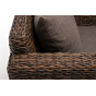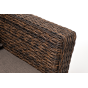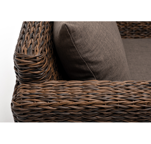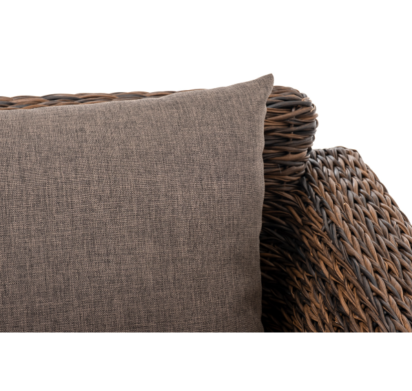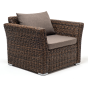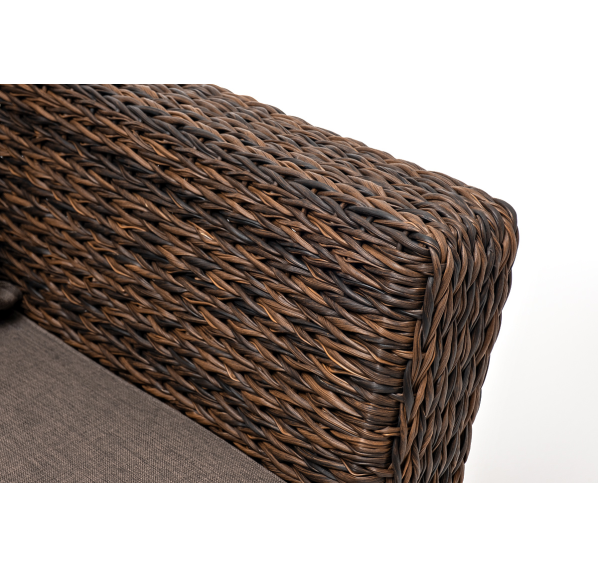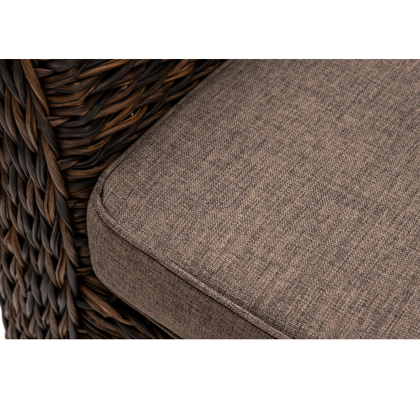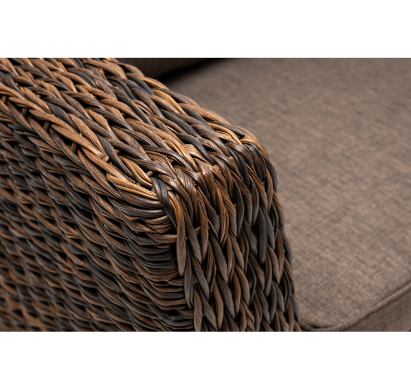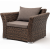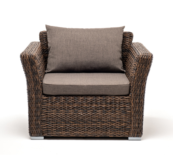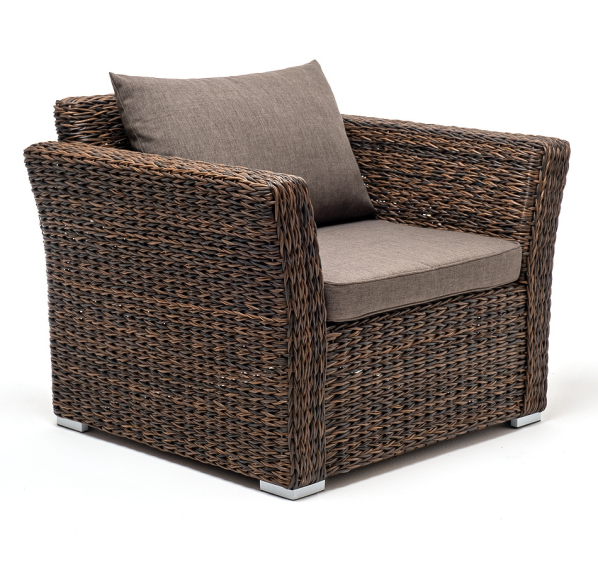 Кресло из искусственного ротанга «Капучино» коричневого цвета, прекрасно подходит для обустройства веранды, а относительно небольшой вес, который составляет 21,5 кг, увеличивает мобильность данной модели. Плетение используется вида «гиацинт».