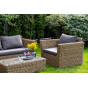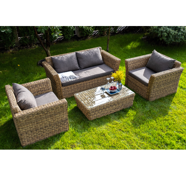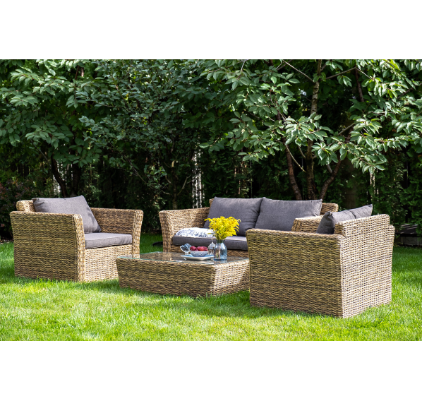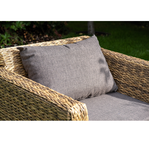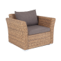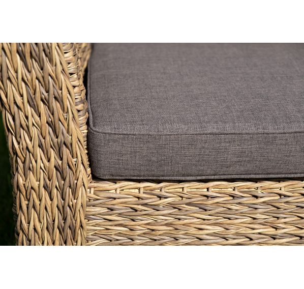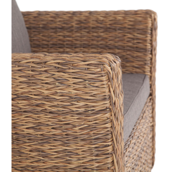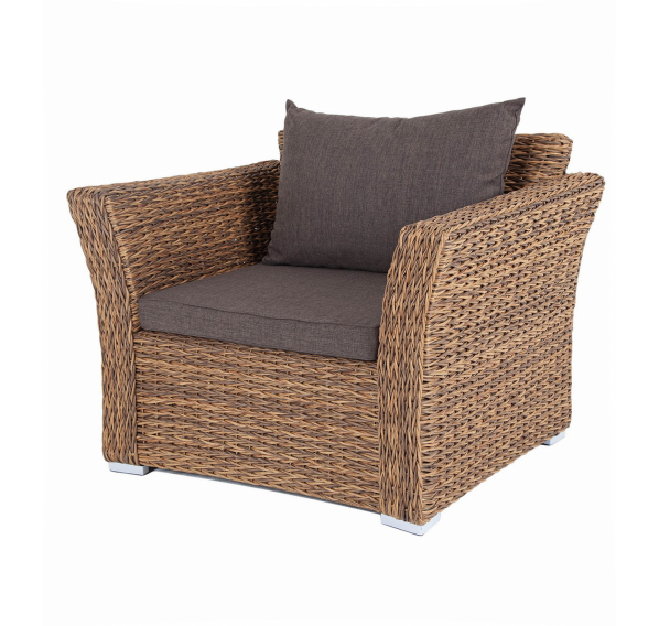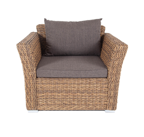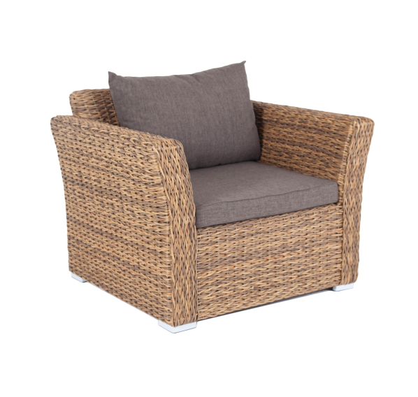 Каркас изготовлен из прочного алюминия, оплетенного вручную искусственным ротангом вида «гиацинт» соломенного оттенка.