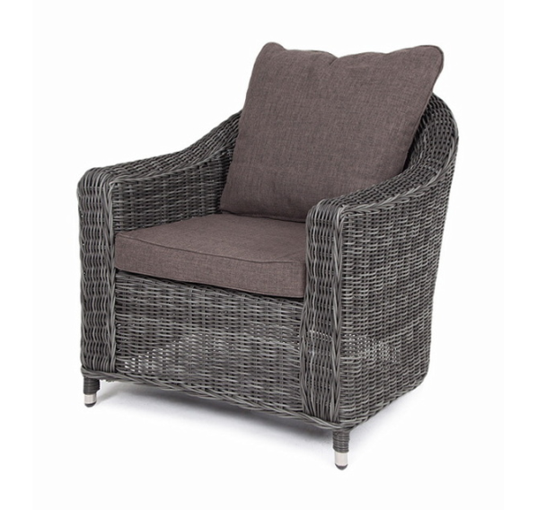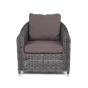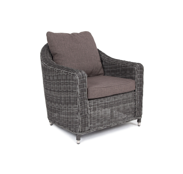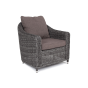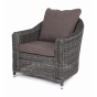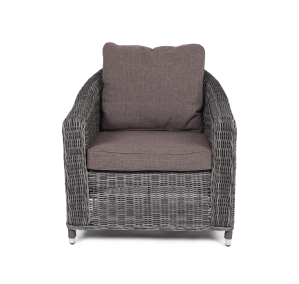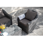 У кресла есть мягкие подушки, выполненые в сером цвете. Они сделаны из прочного полиэстера с плотностью 300гр/м2. Ткань имеет влагоотталкивающую пропитку, которая защищает ее от сильного намокания.