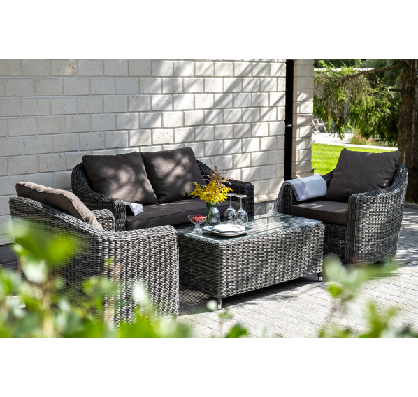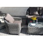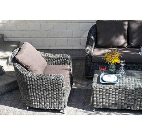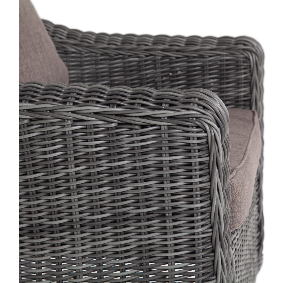 Размер модели – 800×800×800 мм. В качестве основы служит алюминиевый каркас, который оплетен круглым искусственным ротангом графитового оттенка.