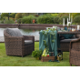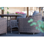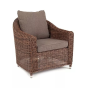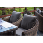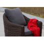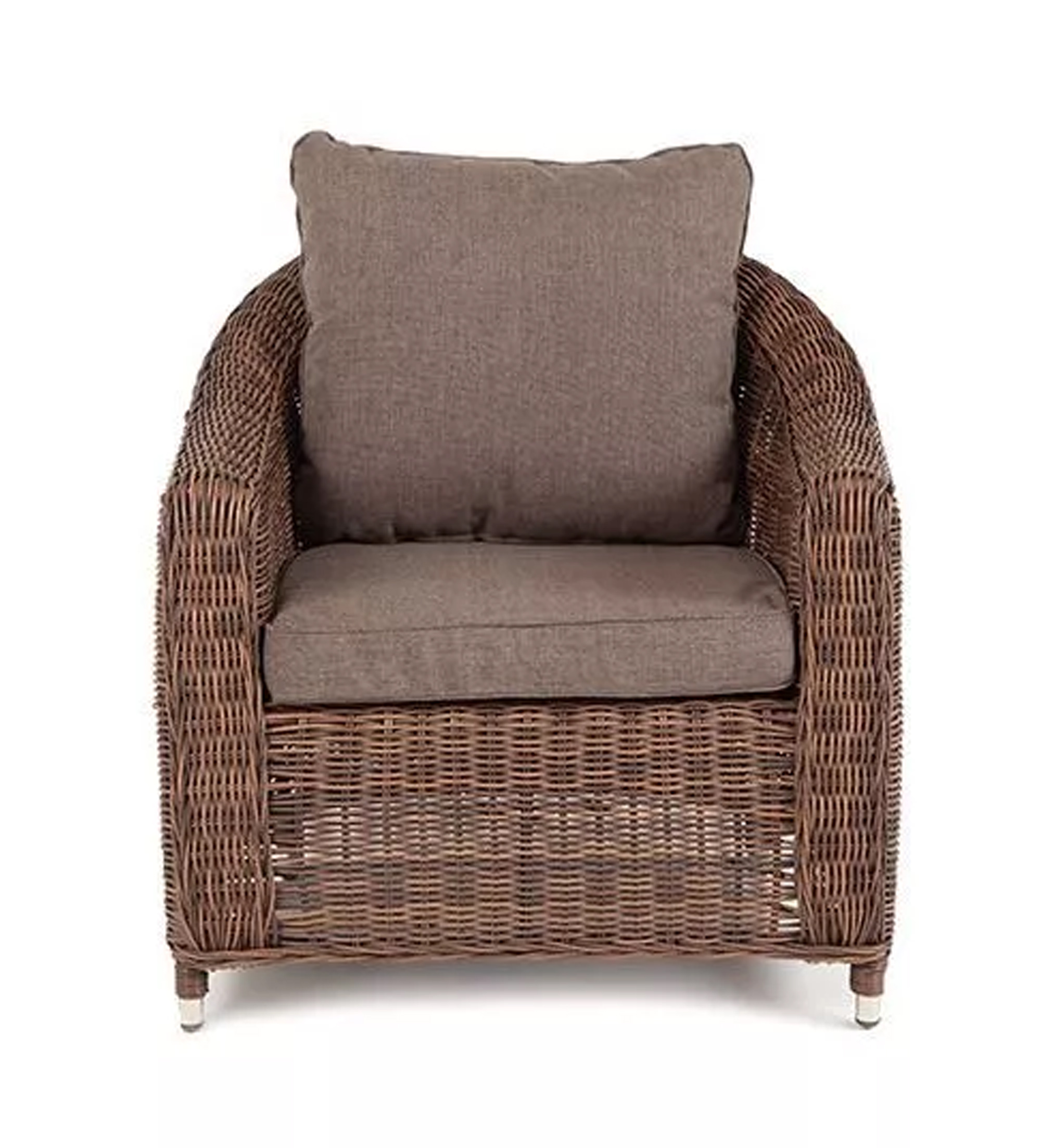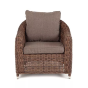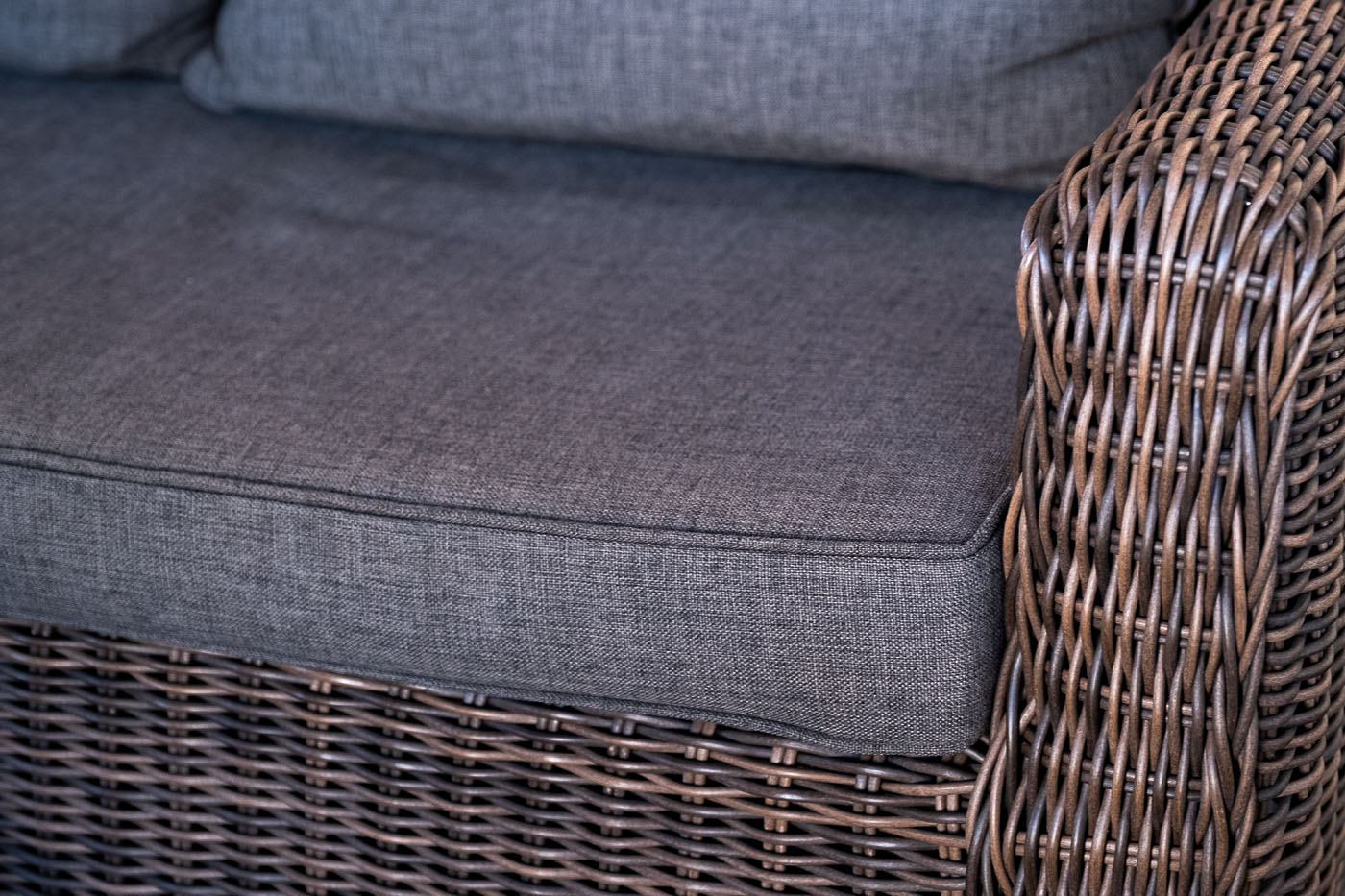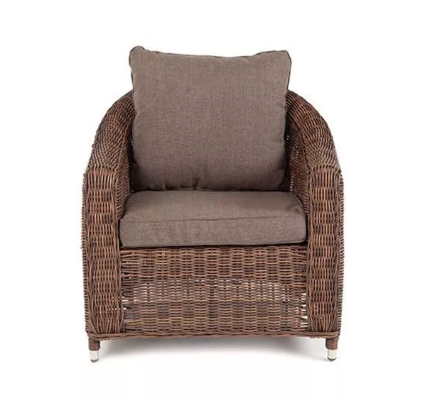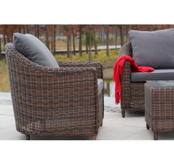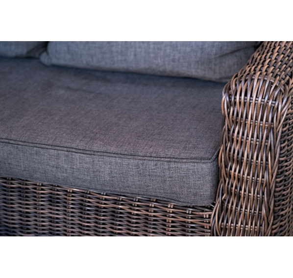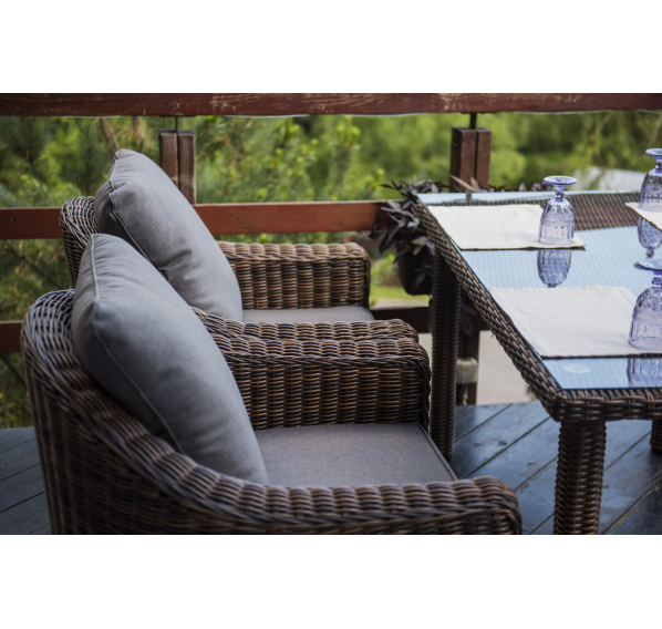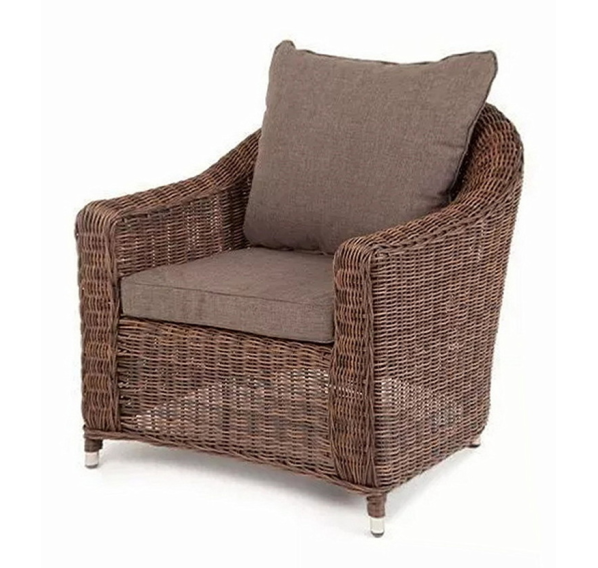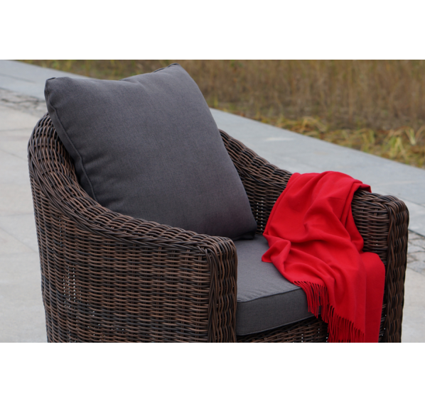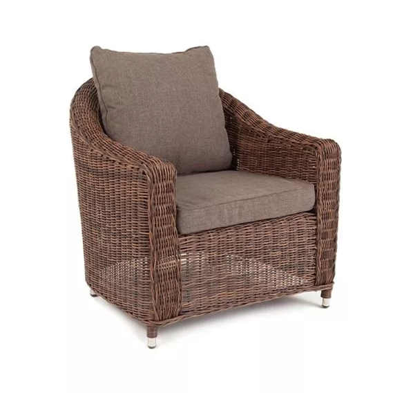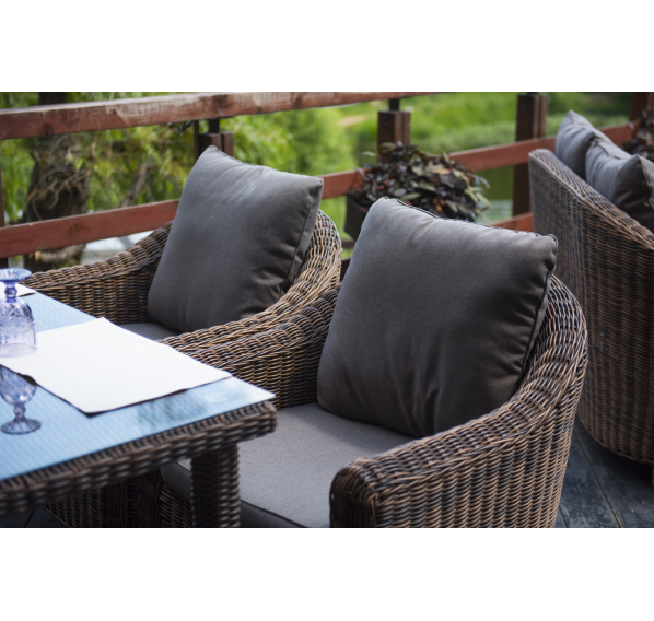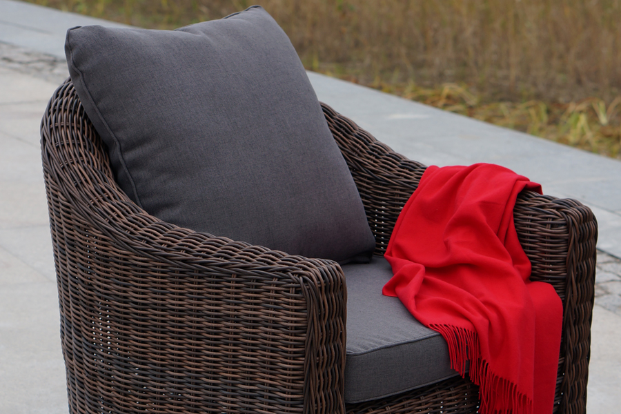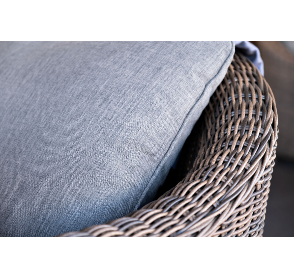 У кресла есть мягкие подушки, выполненые в сером цвете. Они сделаны из прочного полиэстера с плотностью 300гр/м2. Ткань имеет влагоотталкивающую пропитку, которая защищает ее от сильного намокания.