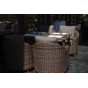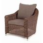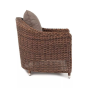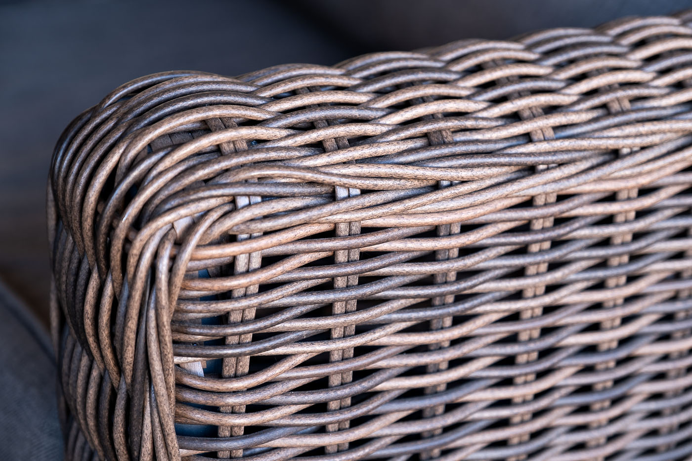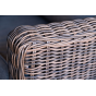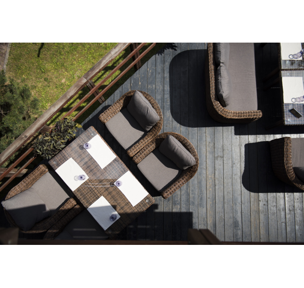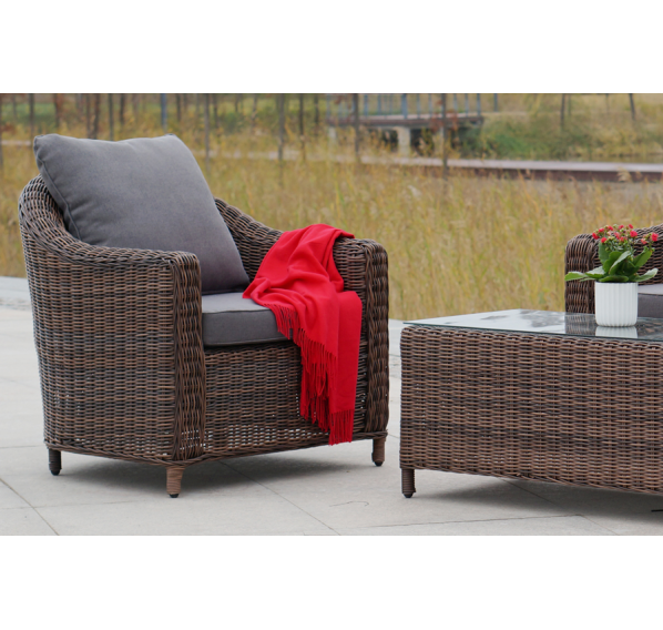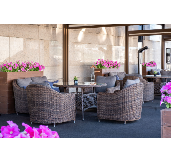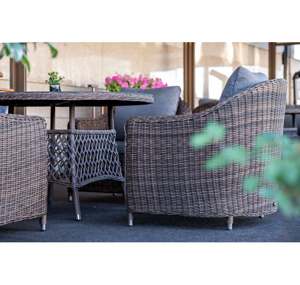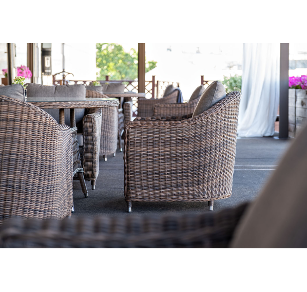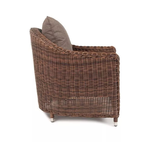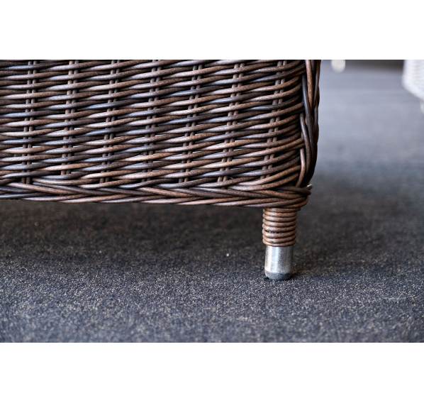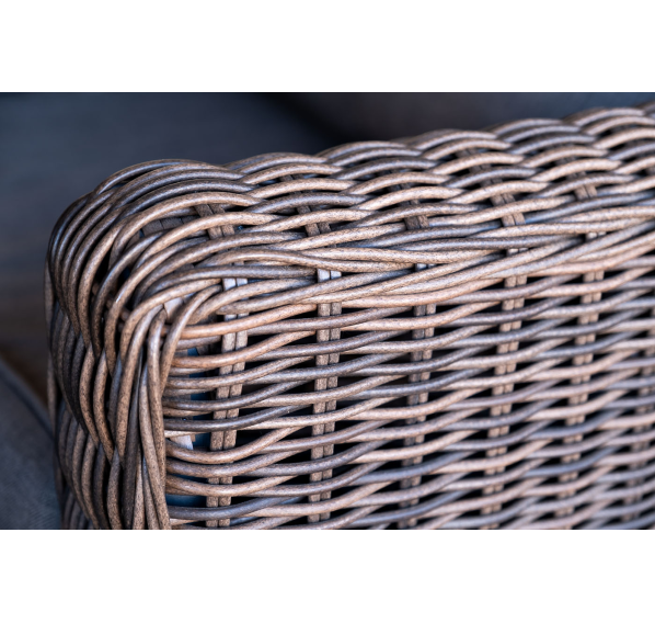 Размер модели – 800×800×800 мм. В качестве основы служит алюминиевый каркас, который оплетен круглым искусственным ротангом коричневого оттенка.