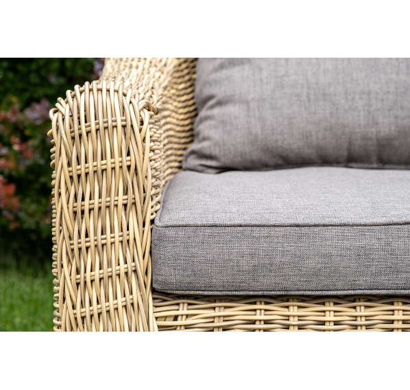У кресла есть мягкие подушки, выполненые в сером цвете. Они сделаны из прочного полиэстера с плотностью 300гр/м2. Ткань имеет влагоотталкивающую пропитку, которая защищает ее от сильного намокания.