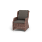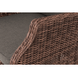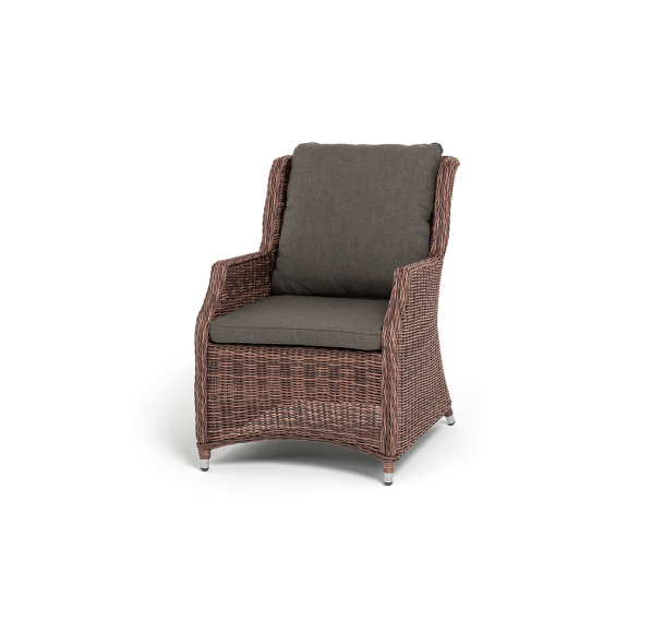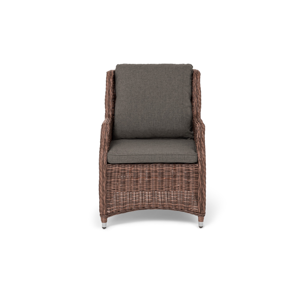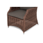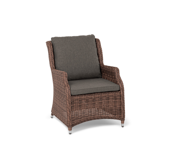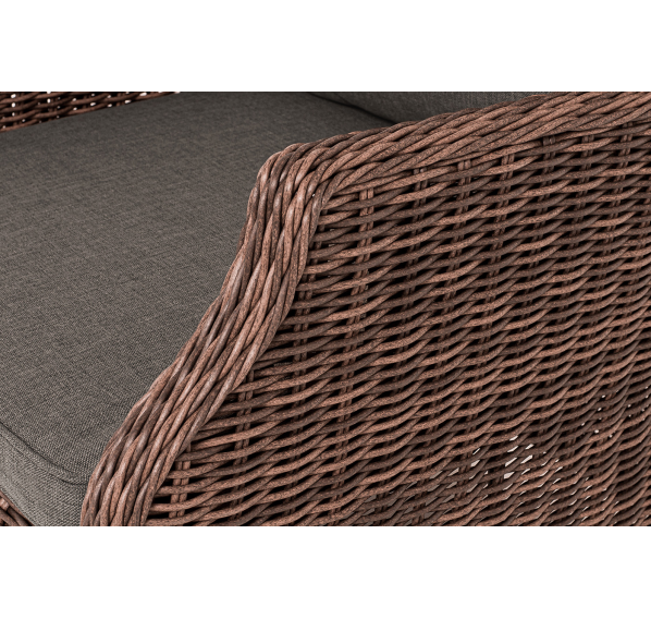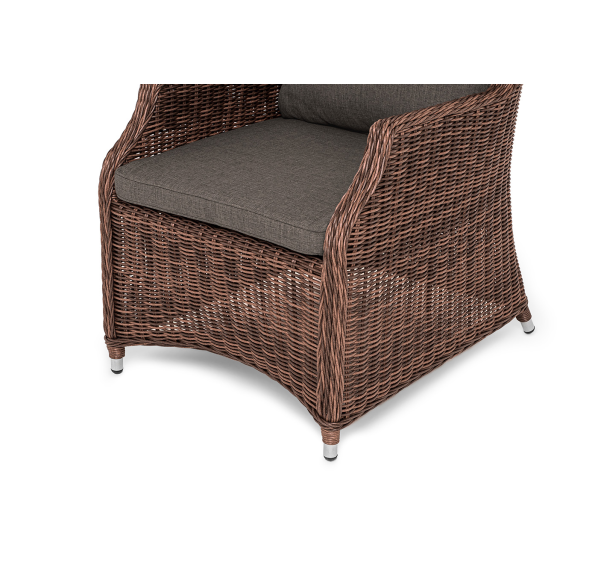 Спинка и подлокотники имеют планые линии, благодаря своим закругленным формам. Каркас мебели сделан из алюминия. Присутствует ручное круглое плетение, при изготовлении которого используется искусственный ротанг. Представлено в коричневом цвете.