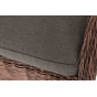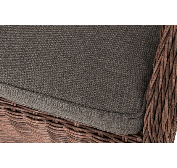 Плетенный стул дополняют мягкие подушки. Они выполнены в сером оттенке. Пошиты изделия из плотного полиэстера 300гр/м2. Ткань предварительно обрабатывается влагоотталкивающей пропиткой.