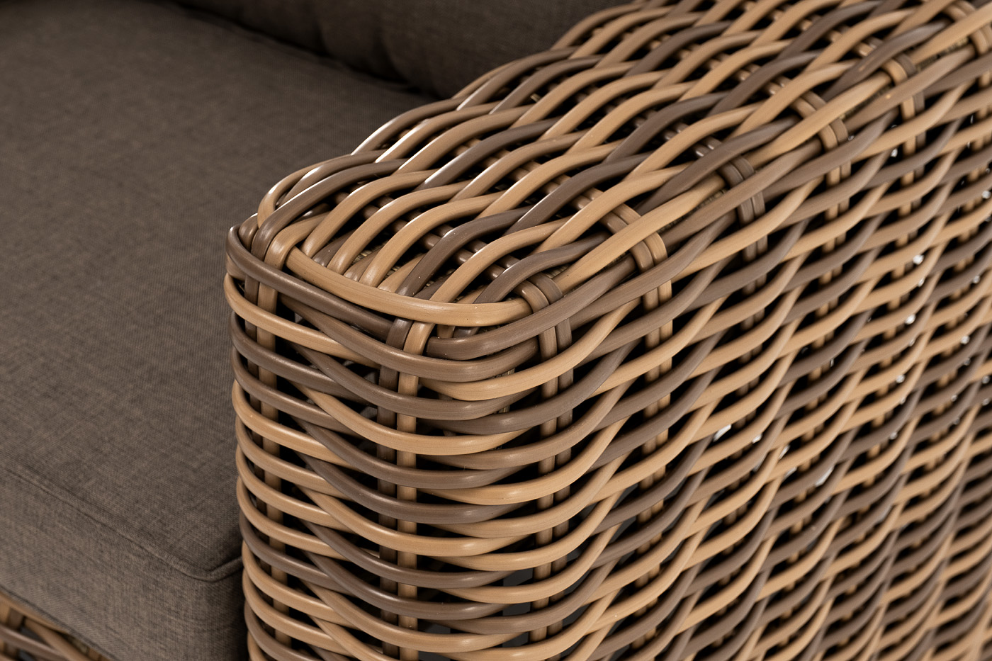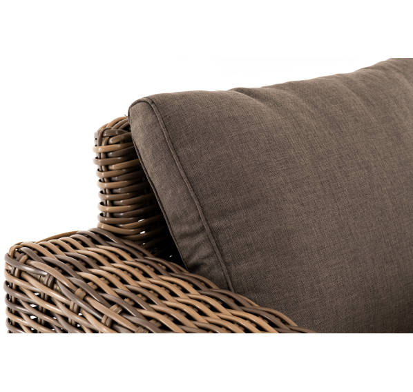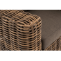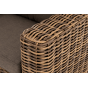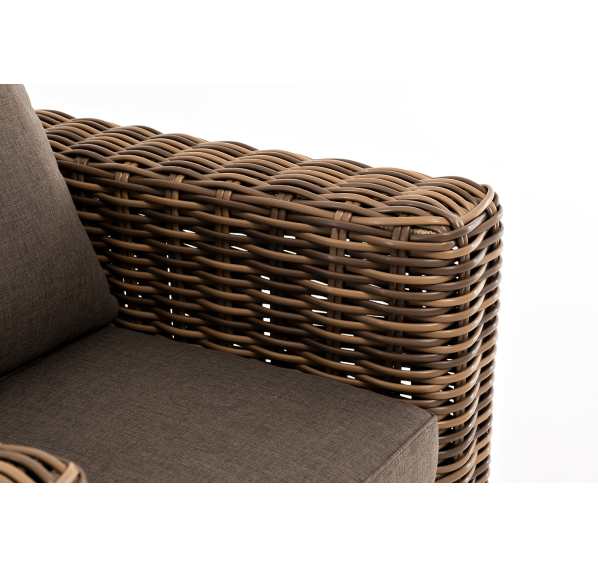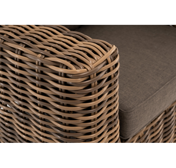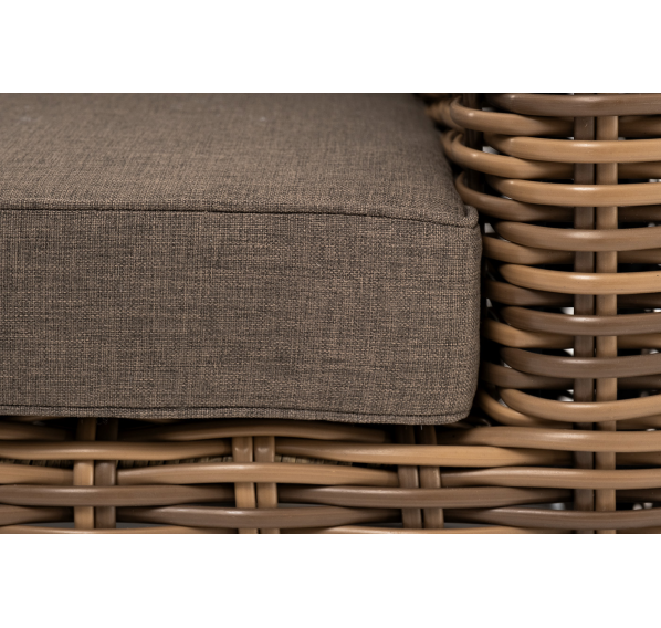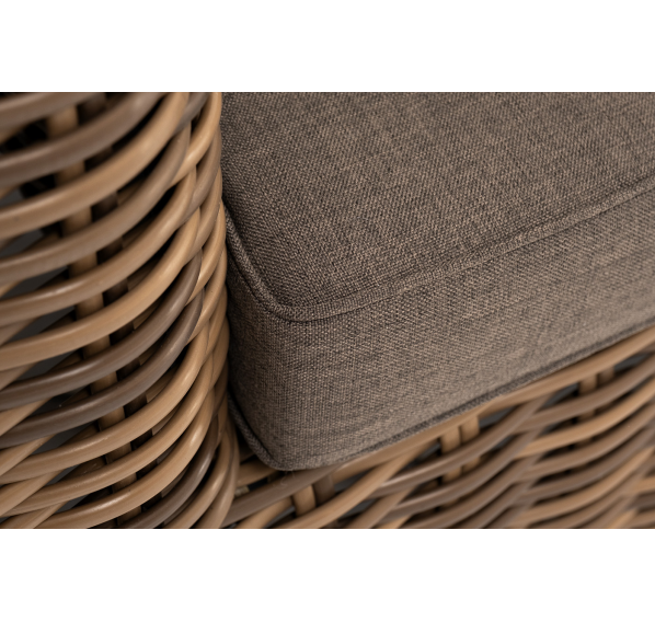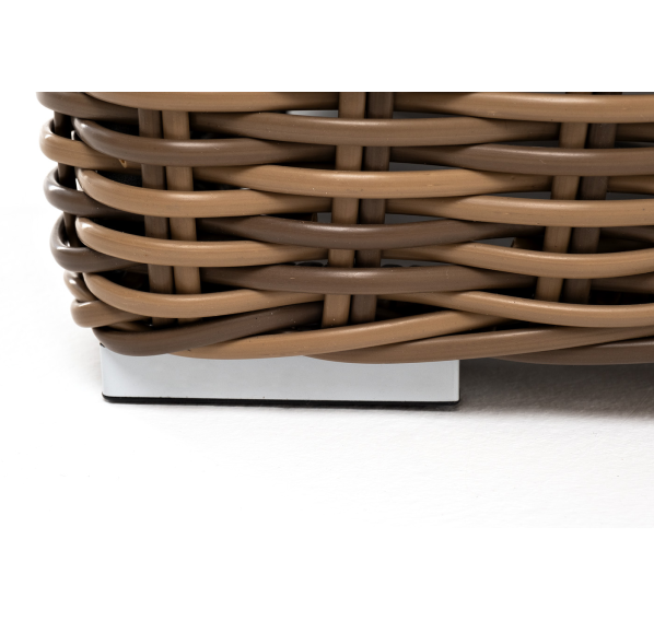 Кресло оснащено каркасом из прочного алюминия, ручное круглое плетение является основным декоративным элементом мебели. Оно выполнено из искусственного ротанга в соломенном цвете.