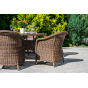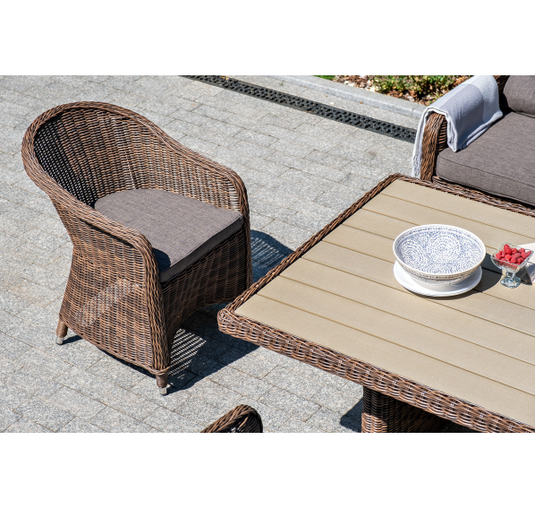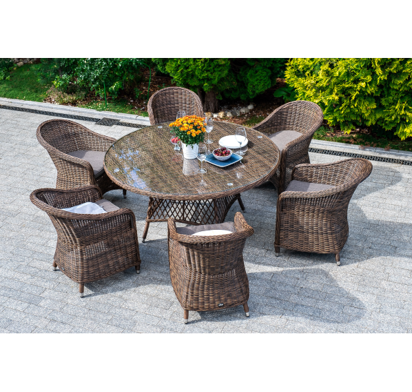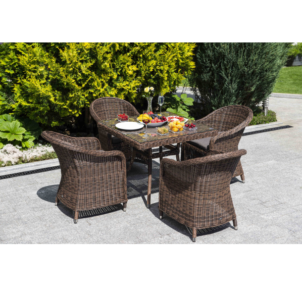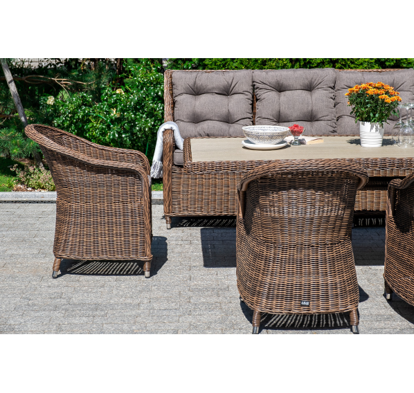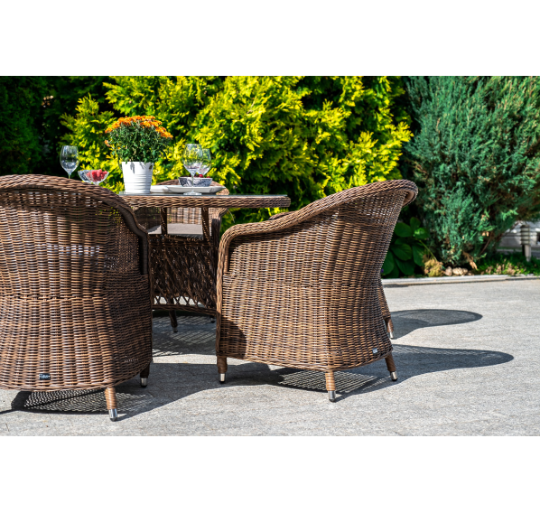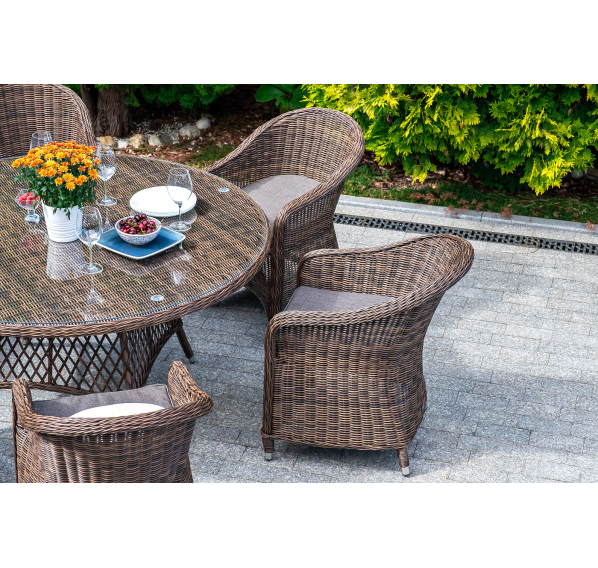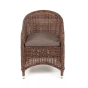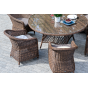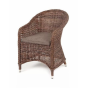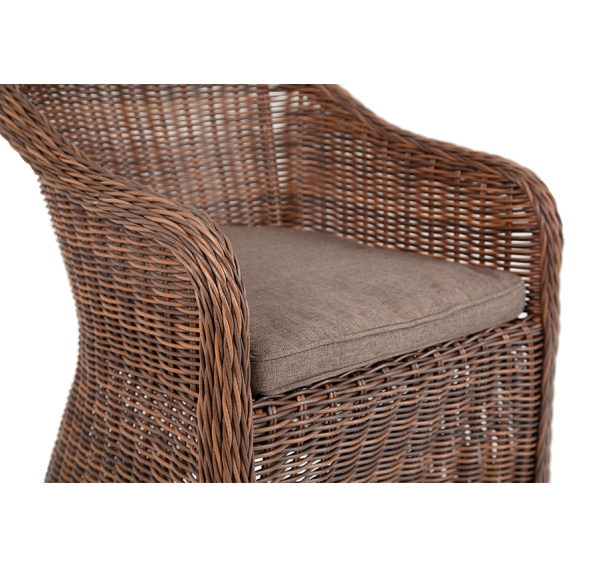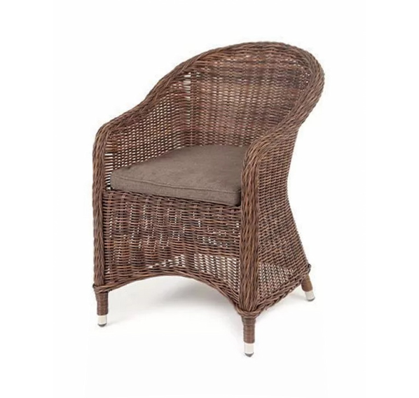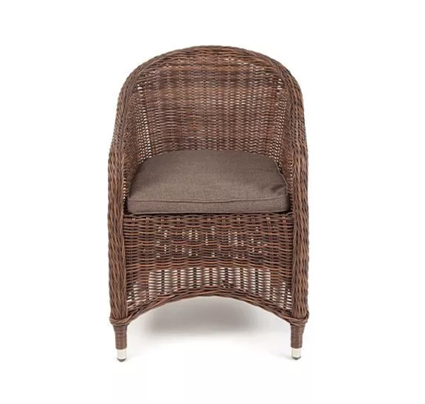 Кресло изготовлено посредством ручного плетения из искусственного ротанга коричневого цвета. Для укрепления конструкции использован алюминиевый каркас. Благодаря ему плетеное кресло остается легким, но прочным.