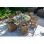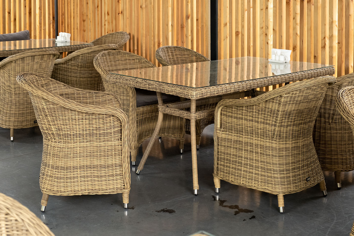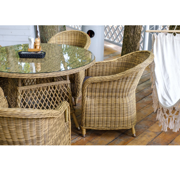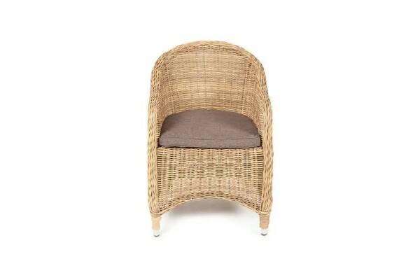 Кресло изготовлено с помощью ручного плетения и выполнено из круглого искусственного ротанга соломенного цвета. Для укрепления конструкции использован алюминиевый каркас. Благодаря ему плетеное кресло остается легким, но прочным.