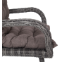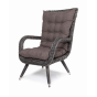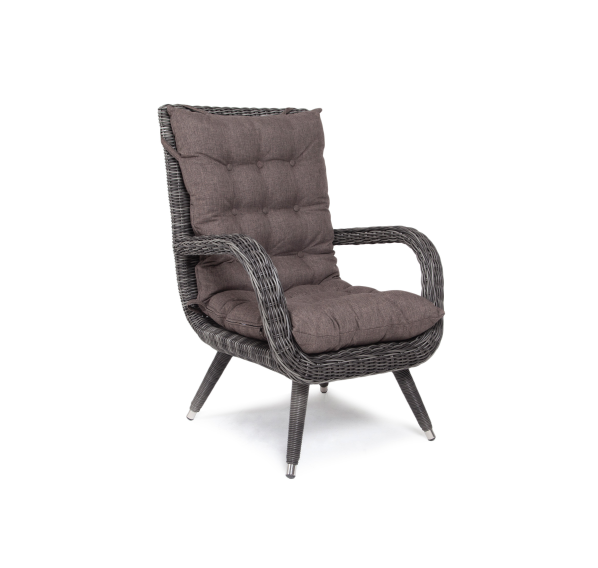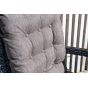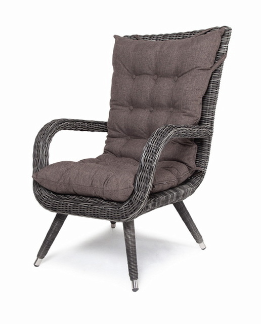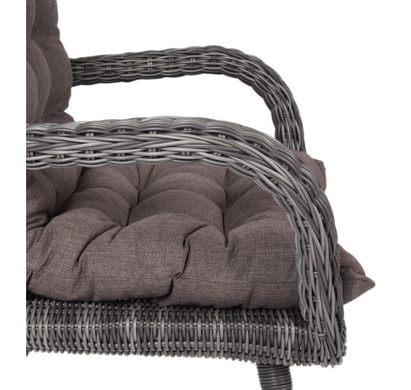 Садовое кресло дополнено мягкими подушками для комфортного размещения. Они выполнены в сером цвете. При их пошиве используется полиэстер с плотностью 300гр/м2. Влагоотталкивающая пропитка усиливает защитные свойства материала.