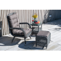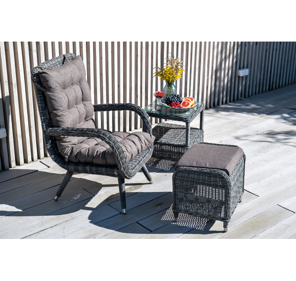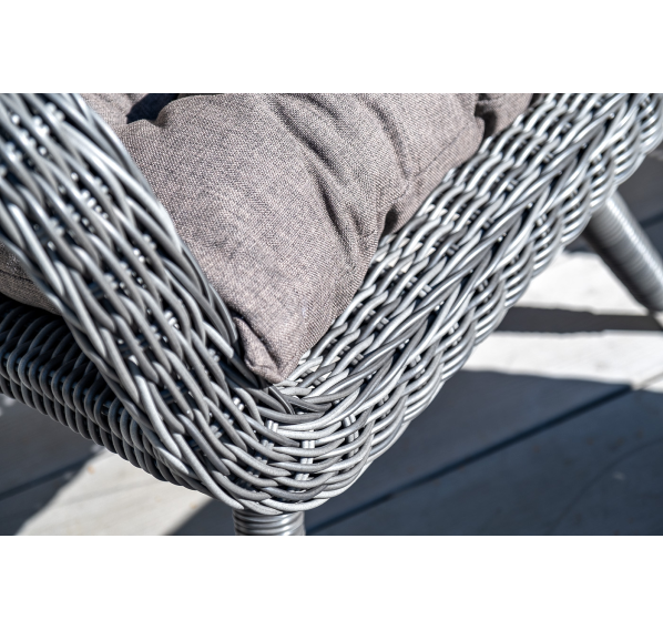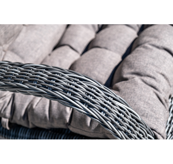 Размер модели – 690×810×990 мм. При изготовлении ее каркаса используется прочный алюминий с высокой износостойкостью. Имеет ручное плетение, которое выполнено из искусственного ротанга в цвете графит.