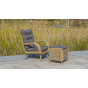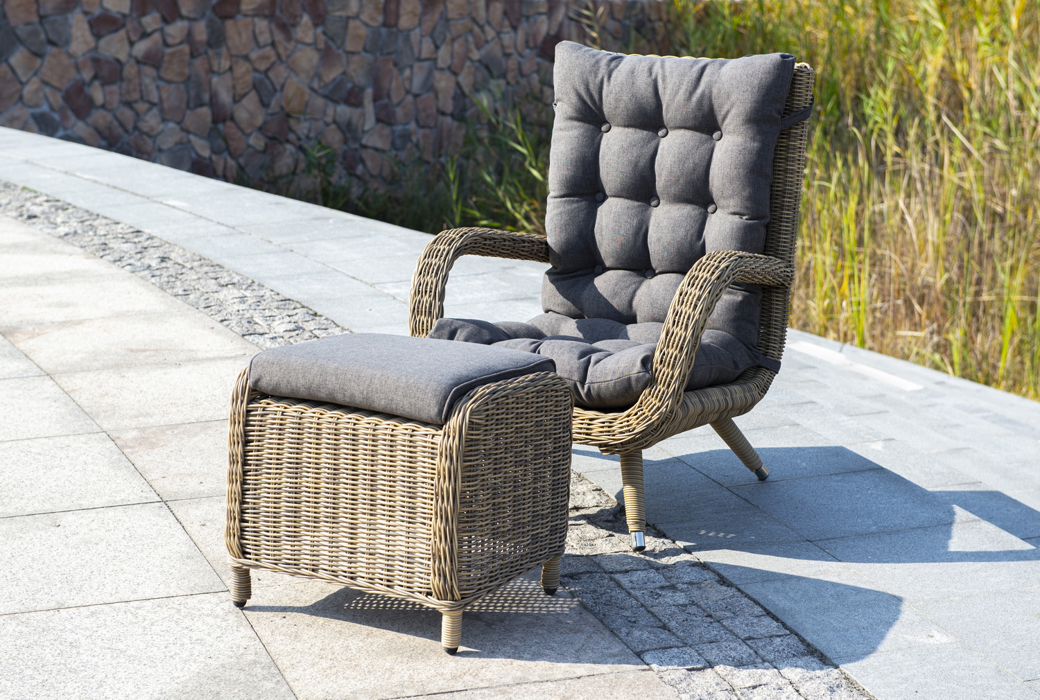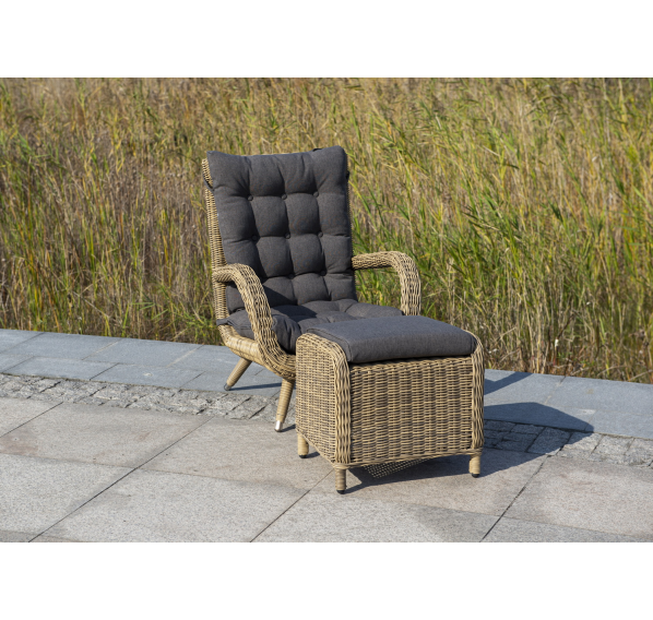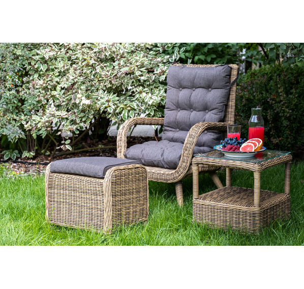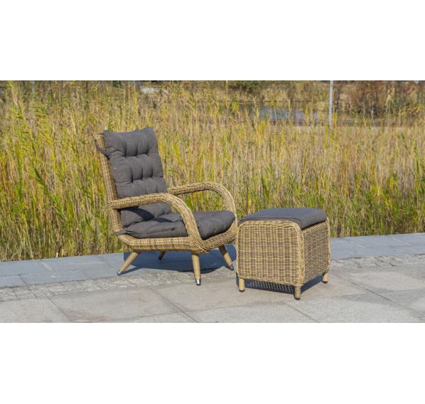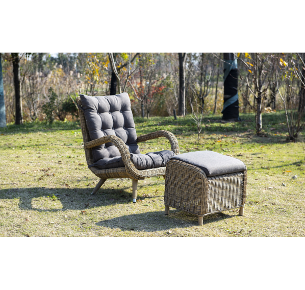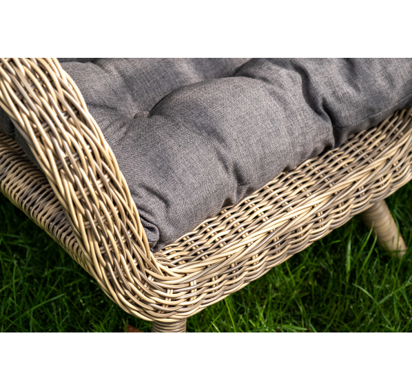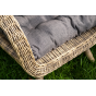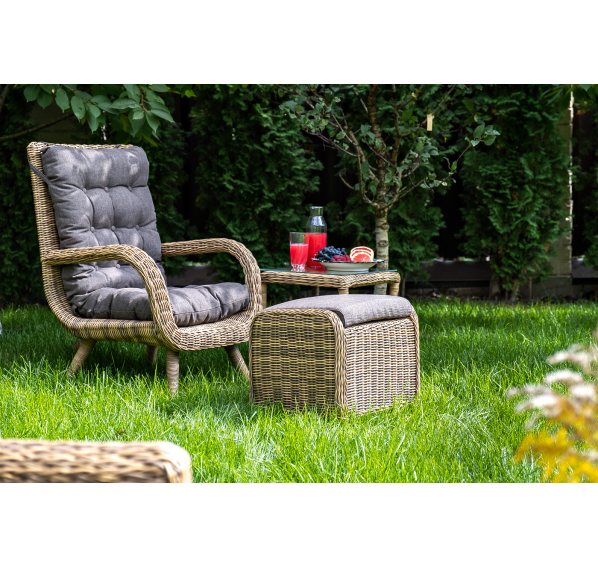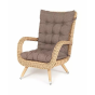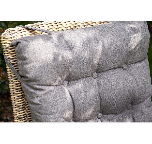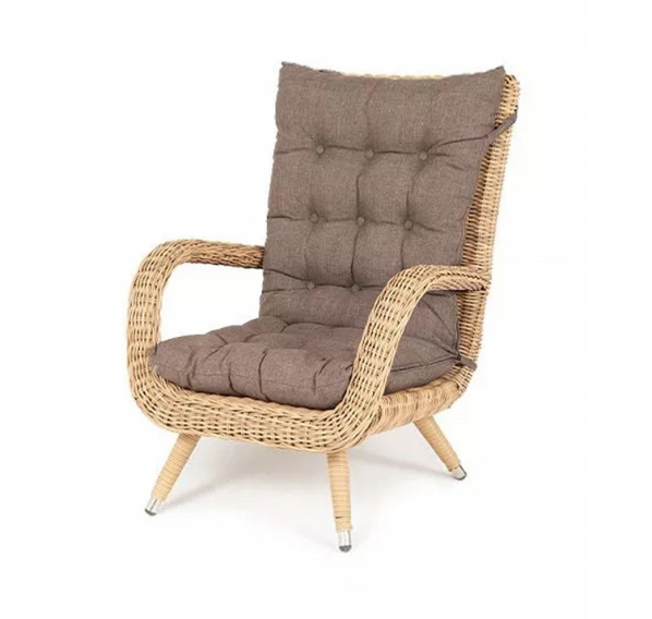 Садовое кресло дополнено мягкими подушками для комфортного размещения. Они выполнены в сером цвете. При их пошиве используется полиэстер с плотностью 300гр/м2. Влагоотталкивающая пропитка усиливает защитные свойства материала.