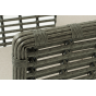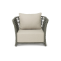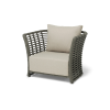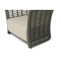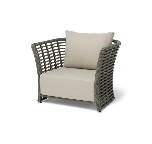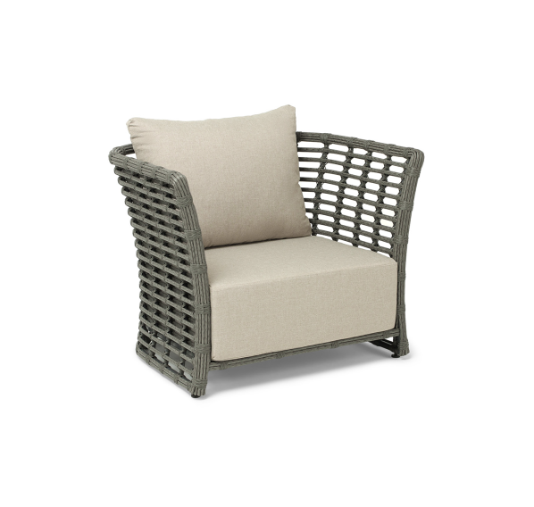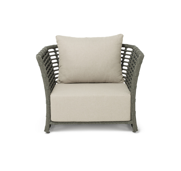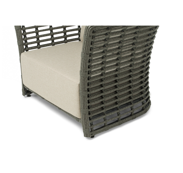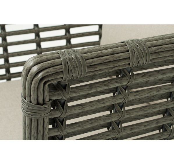 Кресло оснащено каркасом из прочного алюминия, ручное круглое плетение является основным декоративным элементом мебели. Оно выполнено из искусственного ротанга в сером цвете.