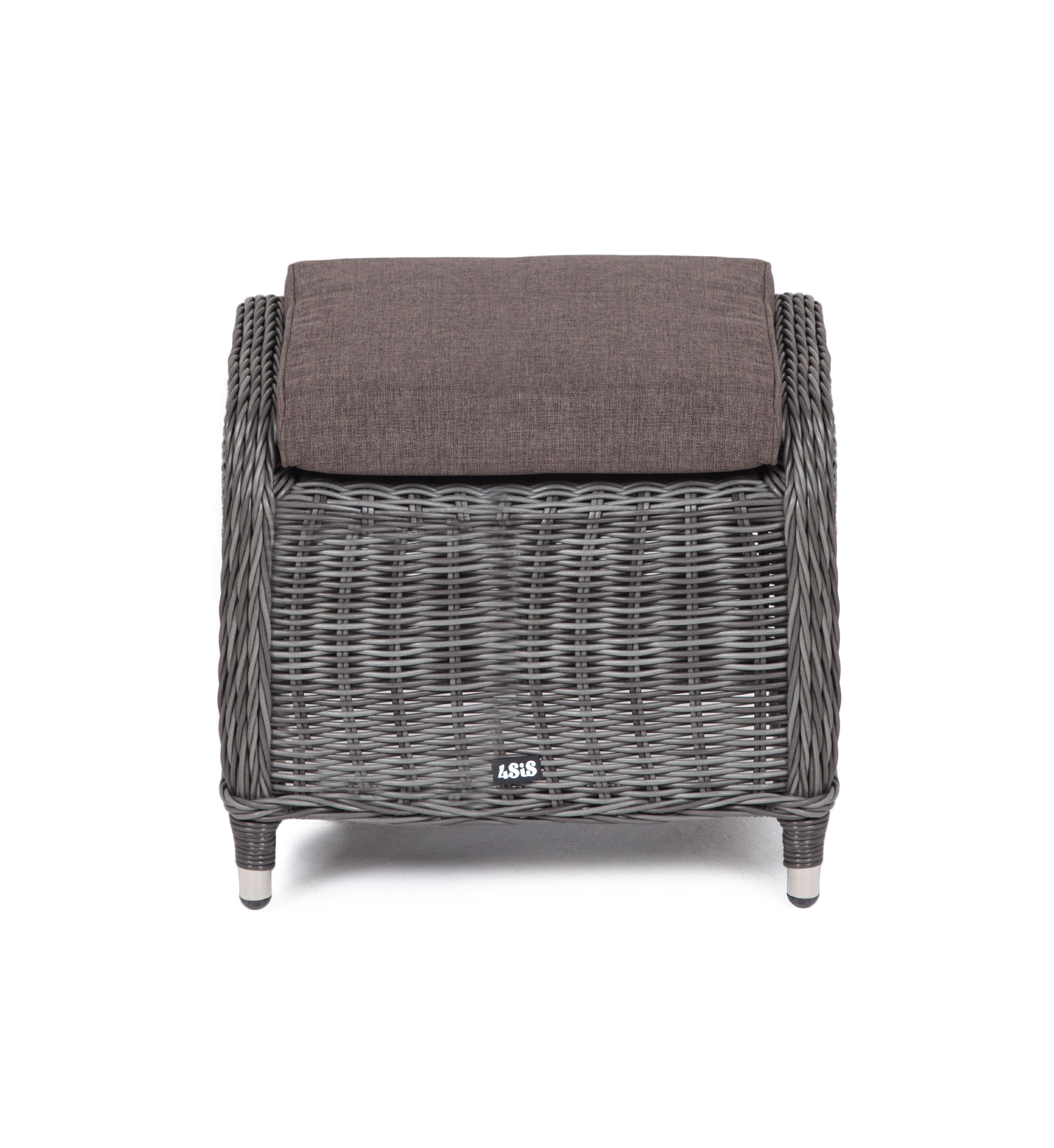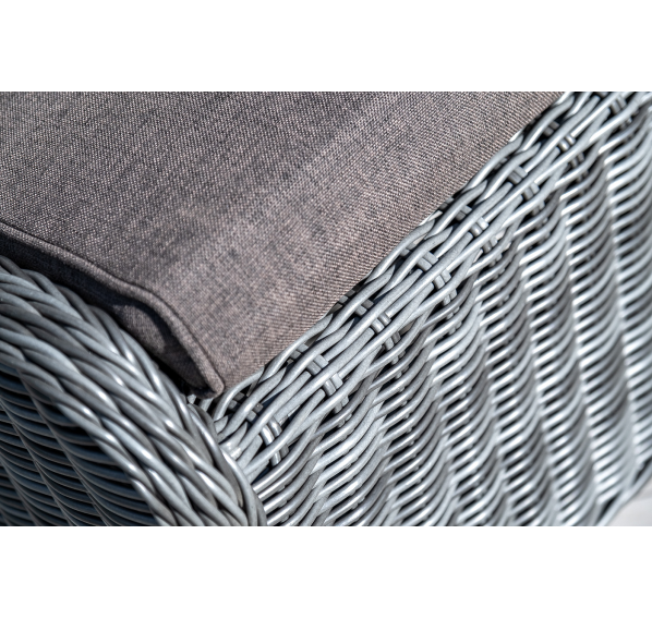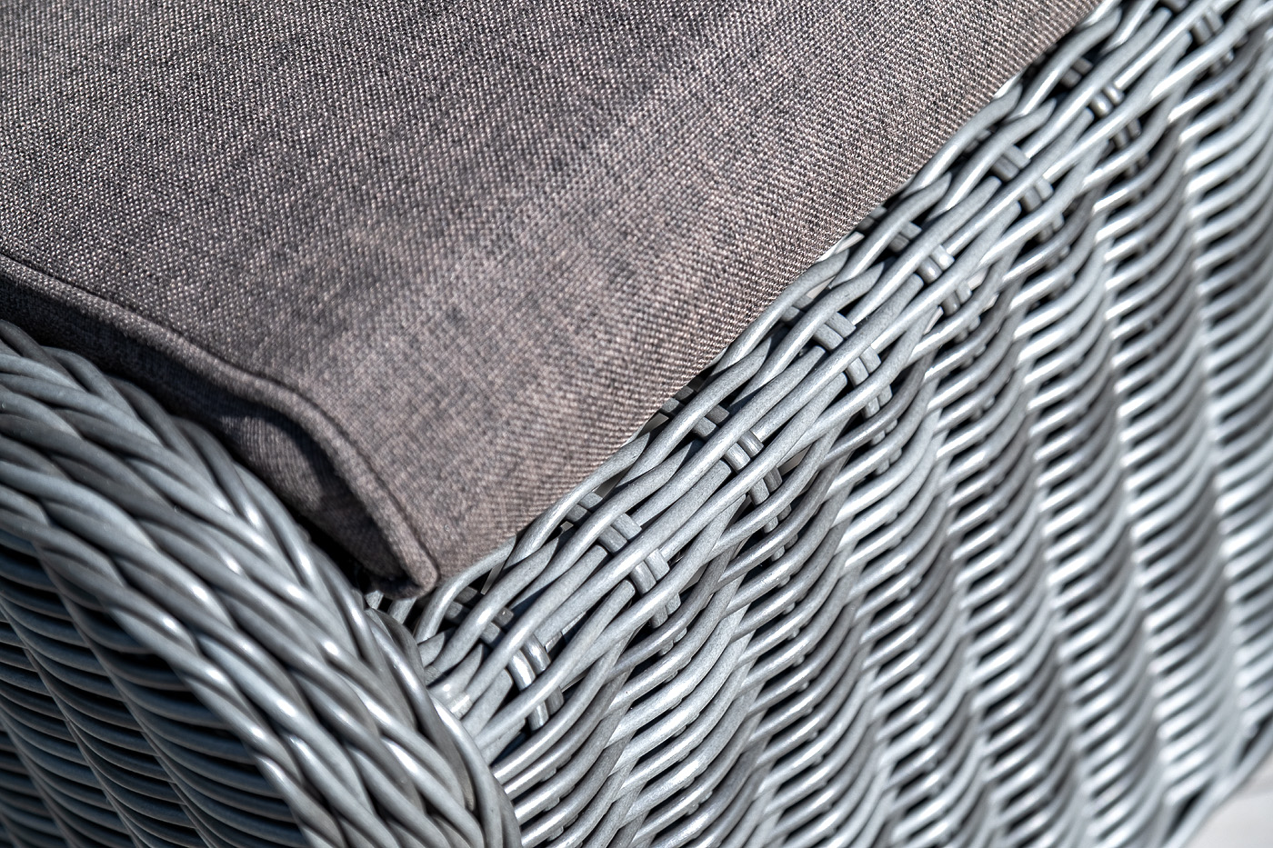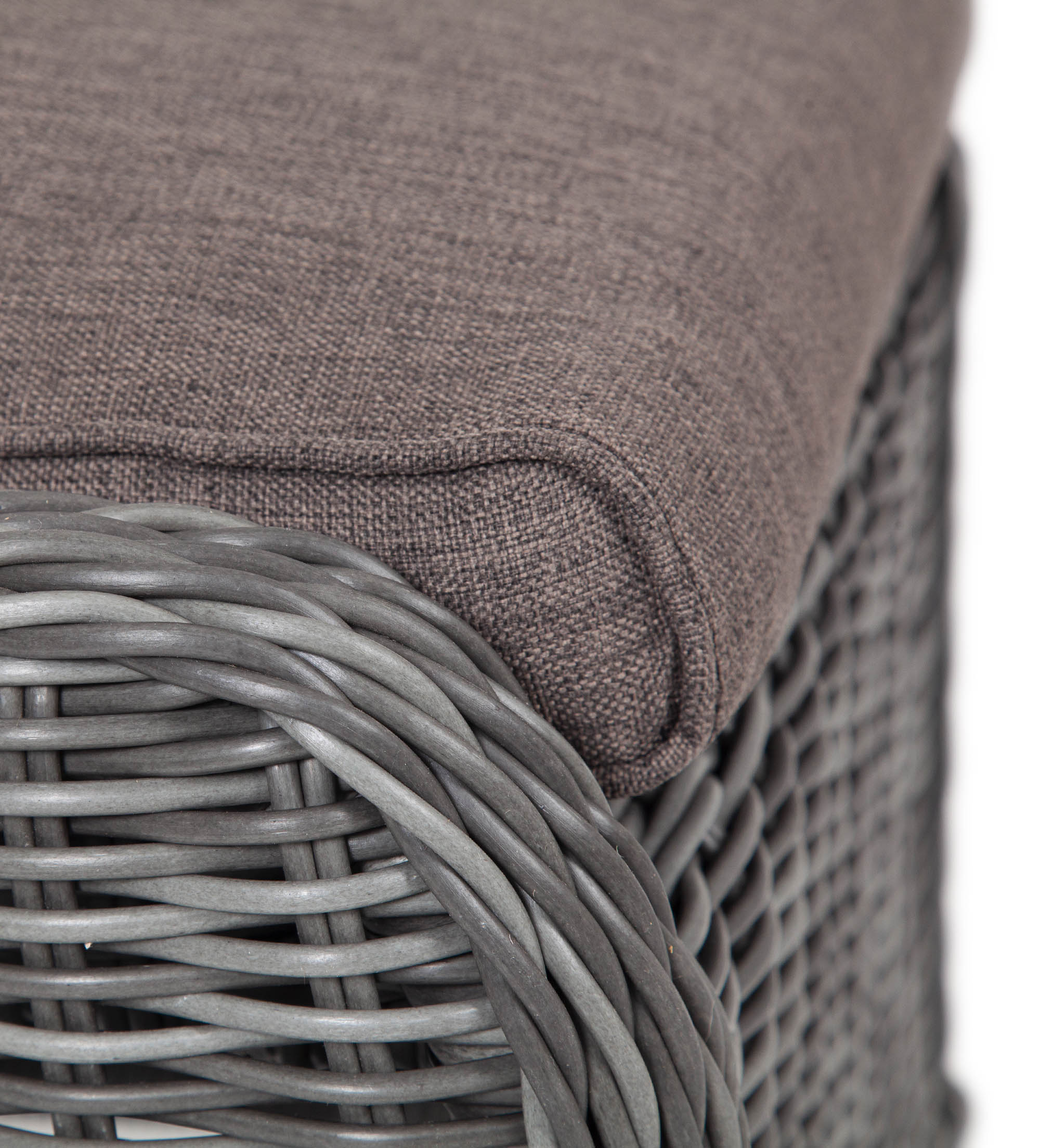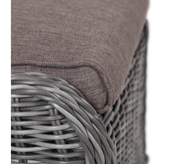 В комплект с плетеным пуфом идет мягкая подушка серого оттенка. При пошиве изделия используется высококачественный полиэстер, его плотность 300гр/м2. Материал обрабатывается влагоотталкивающей пропиткой.