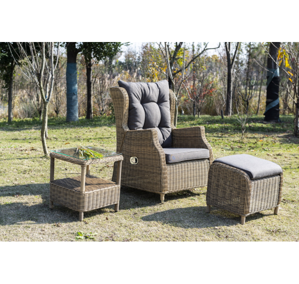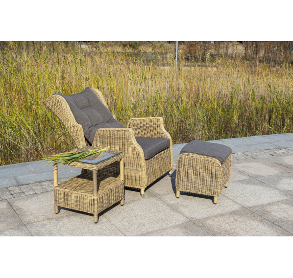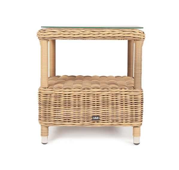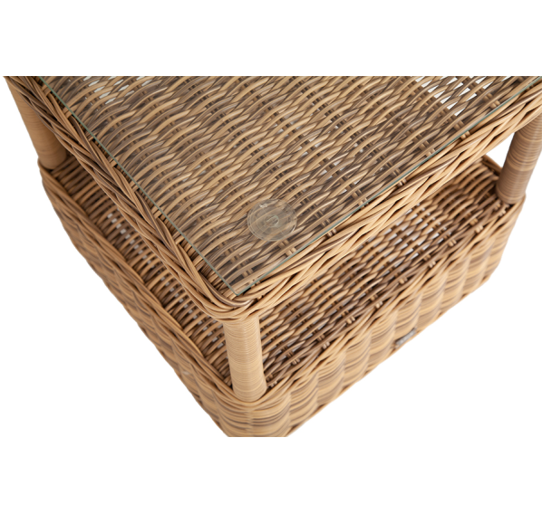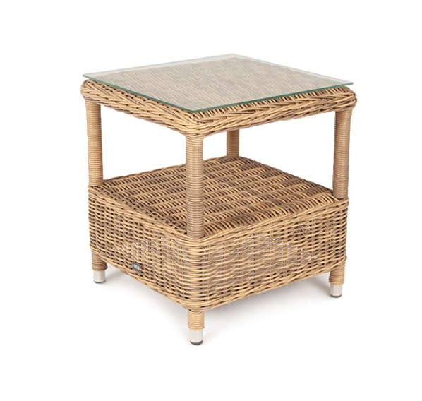 Размер модели – 450×450×520 мм. Ее основу составляет каркас из высококачественного алюминия. Ручное плетение выполнено из круглого искусственного ротанга. Столик имеет дополниельную полку.