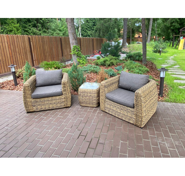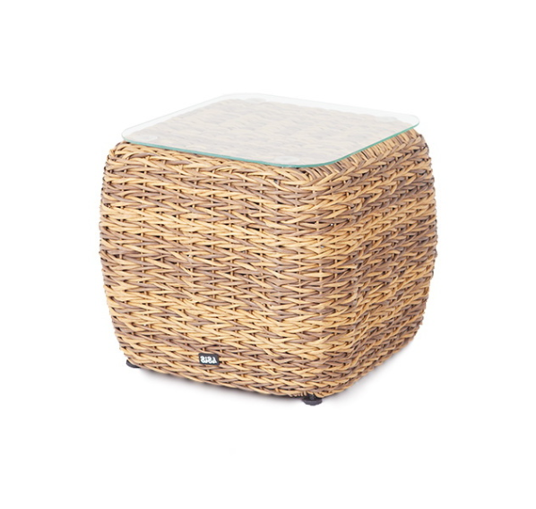 «Кальяри» кофейный столик, алюминиевый каркас, искусственный ротанг вида "гиацинт", ручное плетение, столешница из закаленного стекла толщиной 5 мм, размер: 540×540×430 мм, цвет соломенный, вес: 7,5 кг.