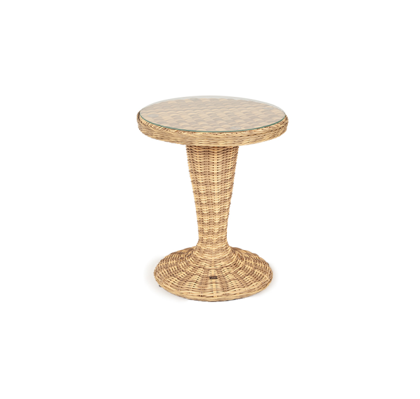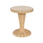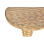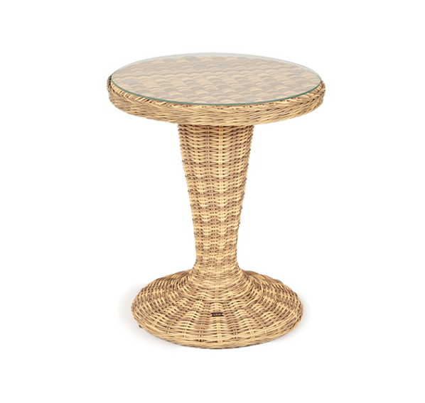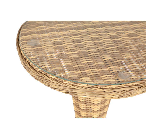 Каркас изготовлен из легкого алюминия и оплетен искусственным ротангом натурального соломенного оттенка. Поверхность столика дополнена стеклянной столешницей из закаленного стекла, толщиной 5 мм.