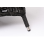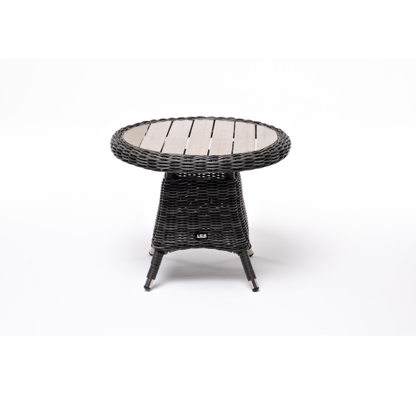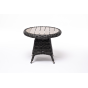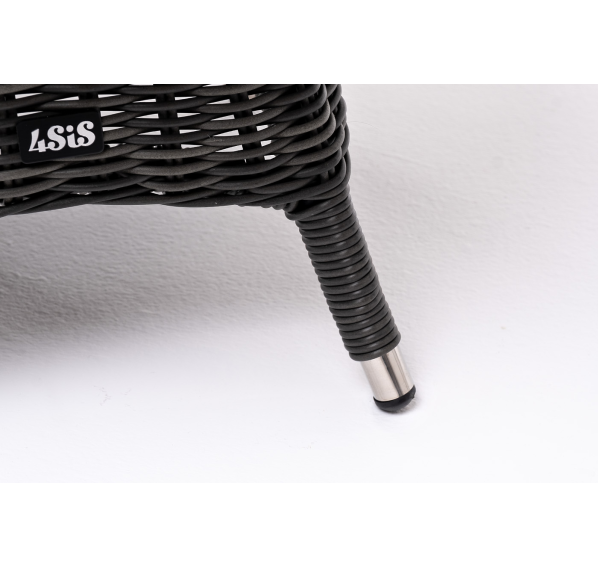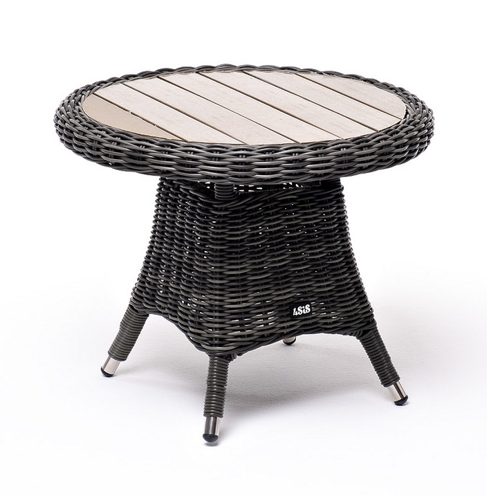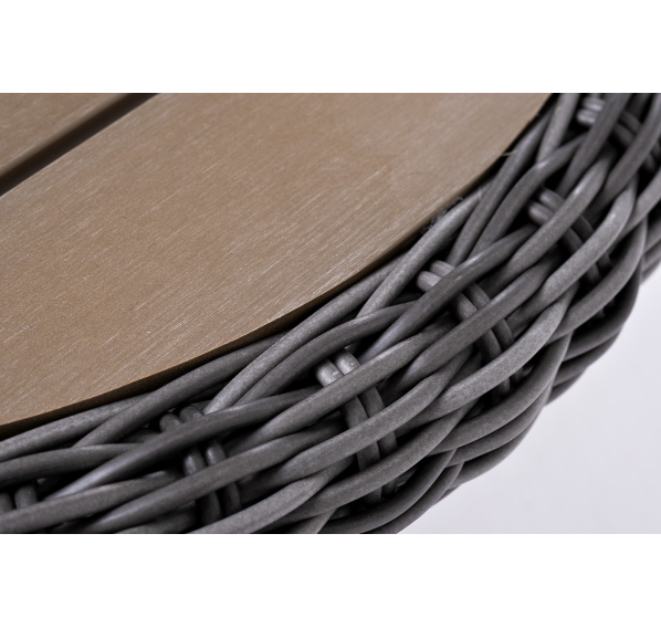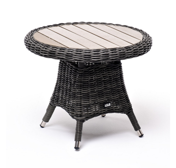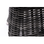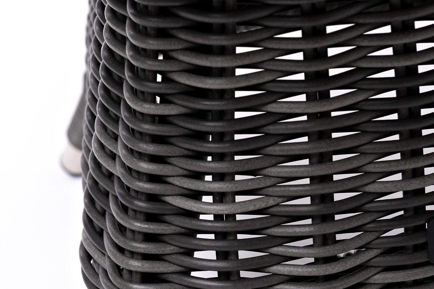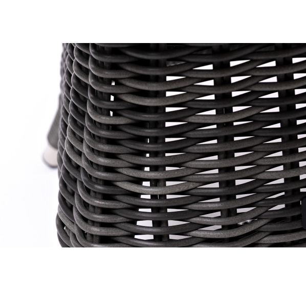Размер модели – 600×600×480 мм. Столик располагает прочным каркасом, который изготовлен из качественного алюминия, отвечающий за надежное расположение конструкции. Весь каркас оплетен вручную круглым искусственным ротангом графитового цвета.