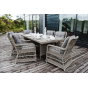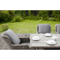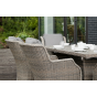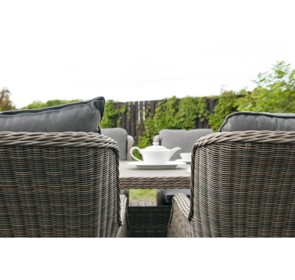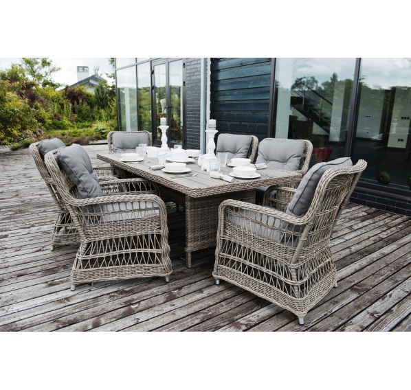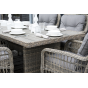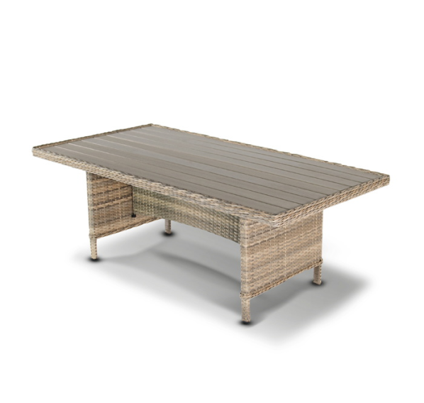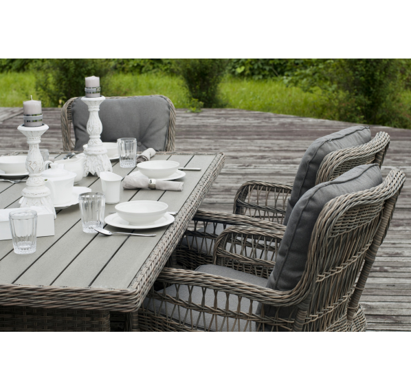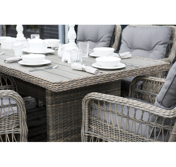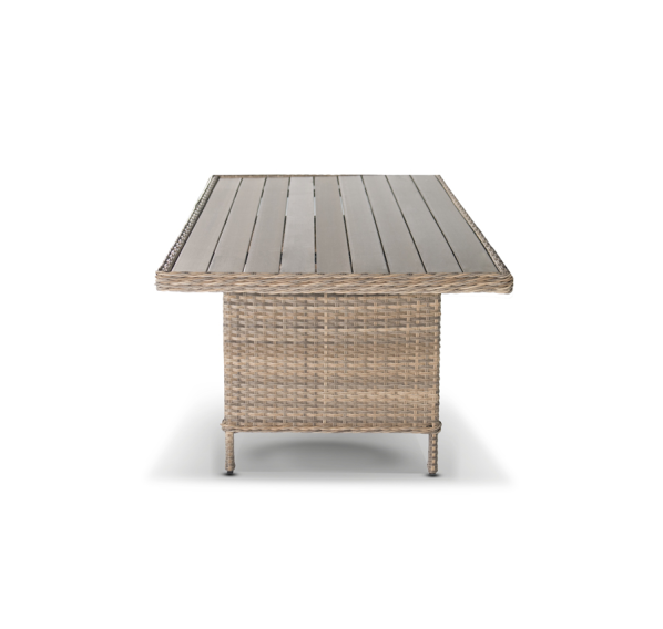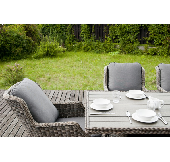 Каркас изготовлен из алюминия, декорированного долговечным искусственным ротангом комбинированного плетения – круглого и плоского. Стол выполнен в натуральном серо-соломенном оттенке, имитирующем цвет натуральной лозы. Столешница произведена из универсального полимерного материала ДПК, устойчивого к переменам погоды.