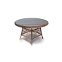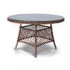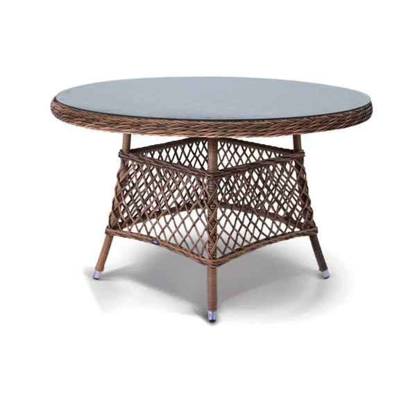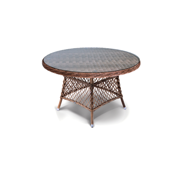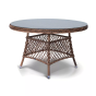 Каркас стола изготовлено из алюминия, благодаря чему его легко перемещать. Металл оплетен синтетическим ротангом круглого ручного плетения насыщенного шоколадного оттенка. Столешница – стекло, устойчивое к механическим повреждениям и высоким температурам.